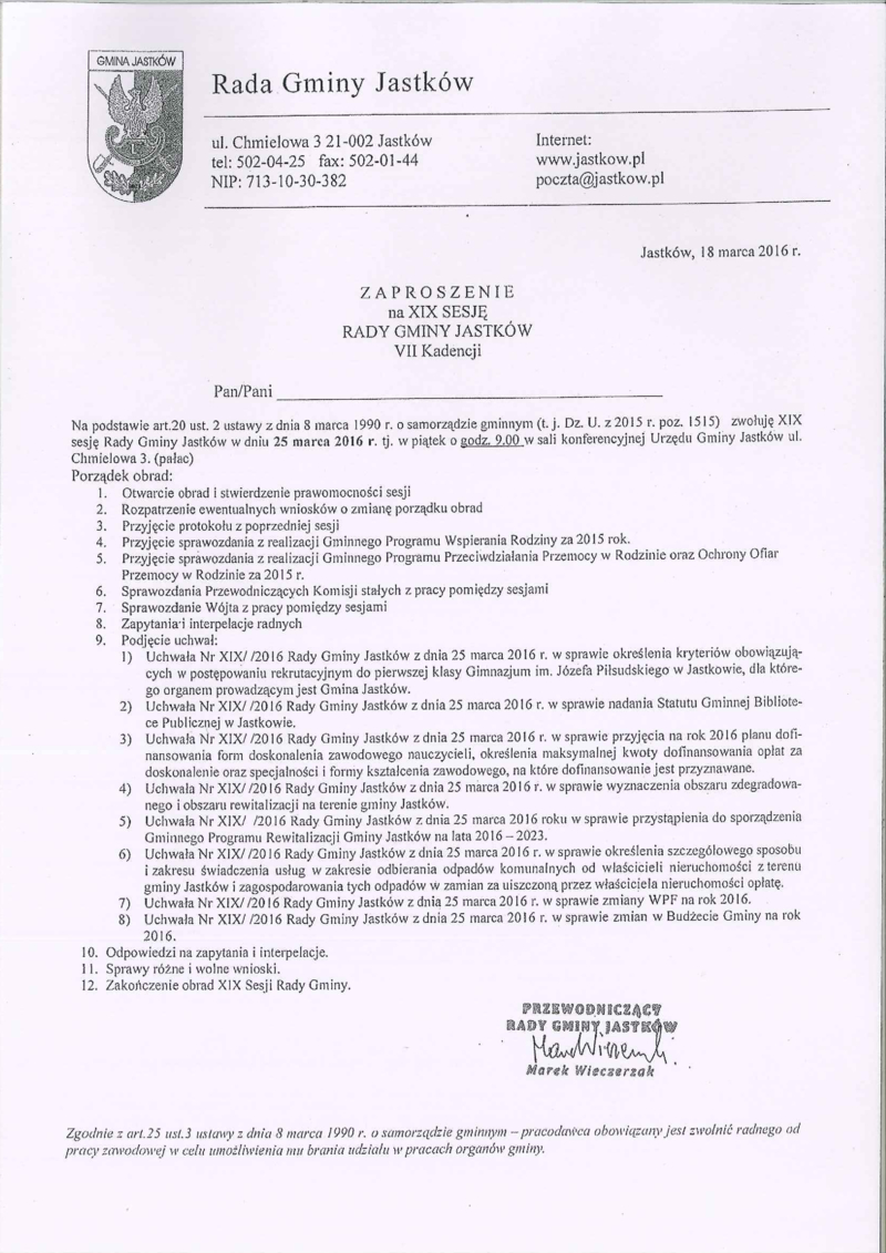 OGŁOSZENIE O PLANOWANYM POSIEDZENIU XIX SESJI RADY GMINY JASTKÓW