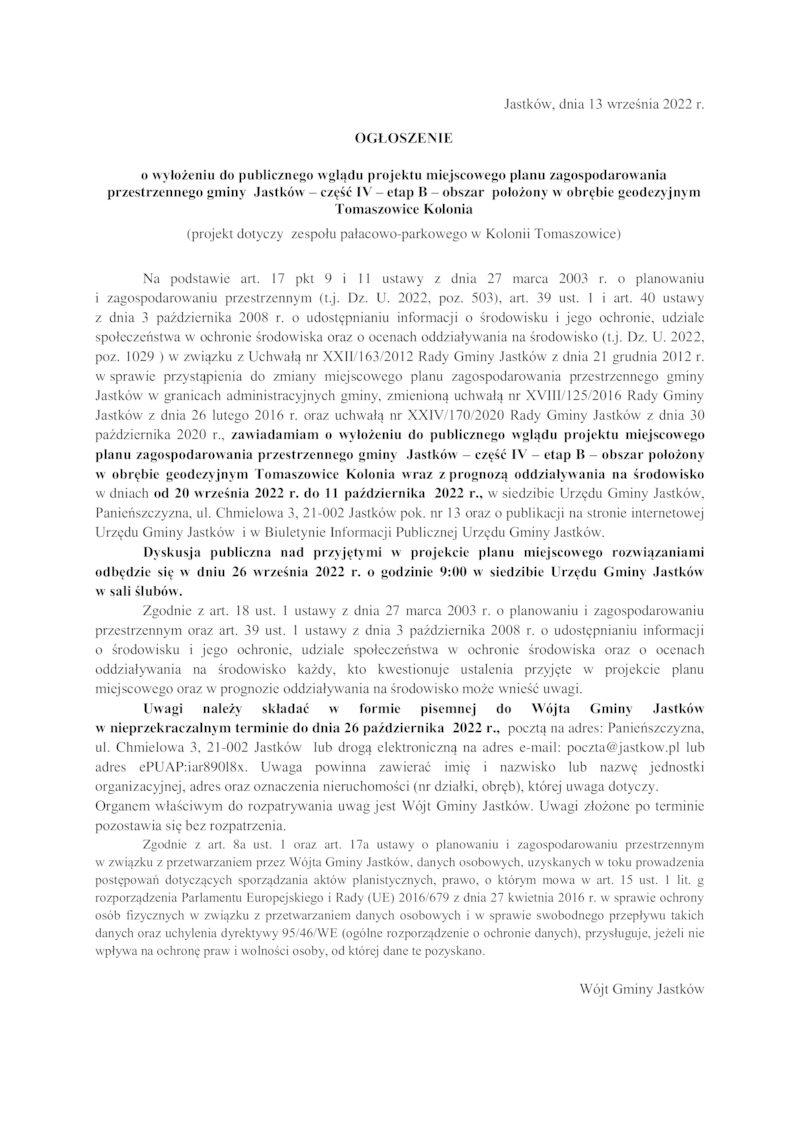 OGŁOSZENIE O WYŁOŻENIU DO PUBLICZNEGO WGLĄDU PROJEKTU MIEJSCOWEGO PLANU ZAGOSPODAROWANIA PRZESTRZENNEGO GMINY JASTKÓW – CZĘŚĆ IV – ETAP B – OBSZAR POŁOŻONY W OBRĘBIE GEODEZYJNYM TOMASZOWICE KOLONIA