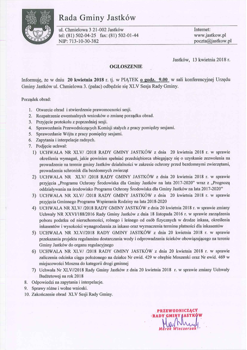 OGŁOSZENIE O XLV SESJI RADY GMINY JASTKÓW W DNIU 20 KWIETNIA 2018R.