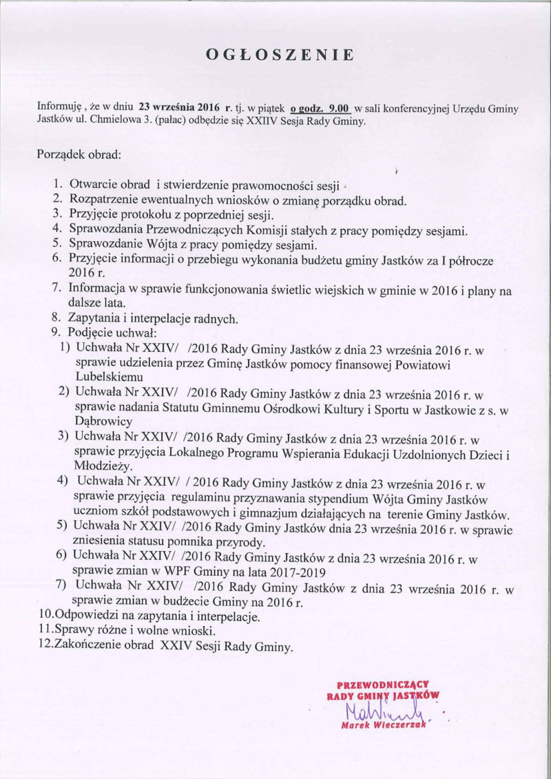 OGŁOSZENIE O XXIV SESJI RADY GMINY JASTKÓW W DNIU 23 WRZEŚNIA 2016 R.