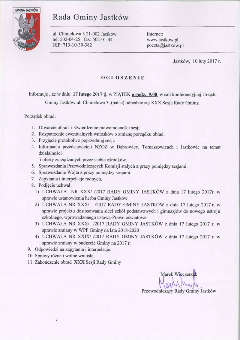 OGŁOSZENIE O XXX SESJI RADY GMINY JASTKÓW W DNIU 17 LUTEGO 2017 ROKU.