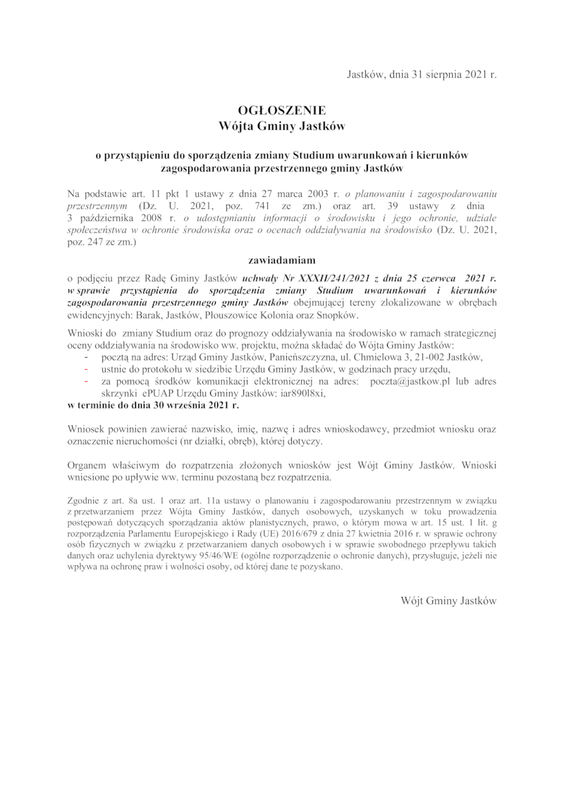 OGŁOSZENIE WÓJTA GMINY JASTKÓW O PRZYSTĄPIENIU DO SPORZĄDZENIA ZMIANY STUDIUM UWARUNKOWAŃ I KIERUNKÓW ZAGOSPODAROWANIA PRZESTRZENNEGO GMINY JASTKÓW