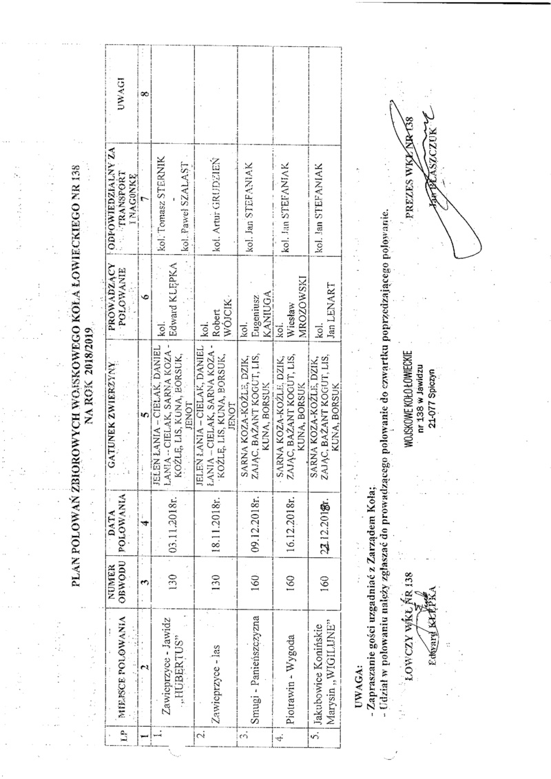 PLAN POLOWAŃ ZBIOROWYCH WOJSKOWEGO KOŁA ŁOWIECKIEGO NR 138