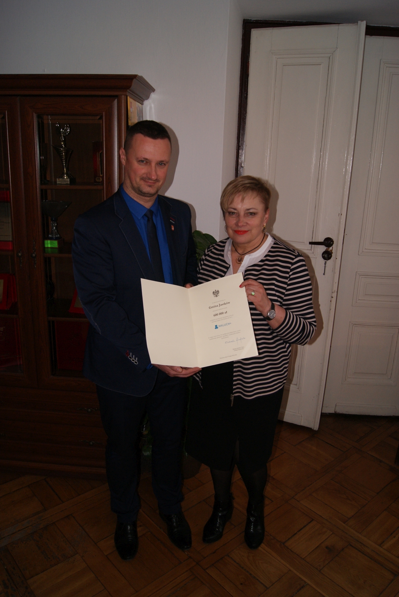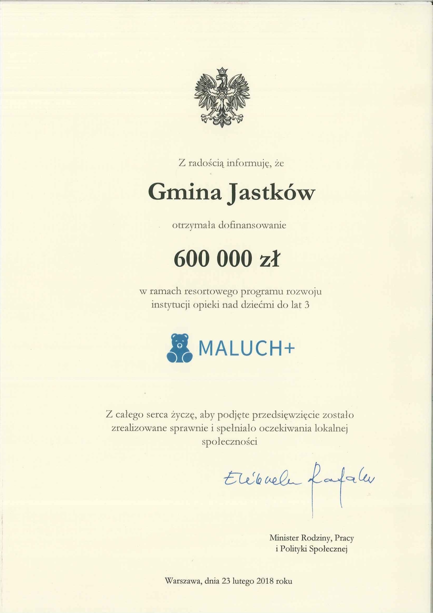 W dniu dzisiejszym w Lubelskim Urzędzie Wojewódzkim pani Barbara Czubak Kierownik Referatu Edukacji, Kultury, Sportu i Spraw Społecznych wraz z panem Andrzejem Decem Zastępcą Wójta Gminy Jastków , odebrali od pana Krzysztofa Michałkiewicza Wiceministra w Ministerstwie Rodziny, Pracy i Polityki Społecznej promesę w wysokości 600 000,00 zł w ramach rządowego resortowego programu rozwoju instytucji opieki nad dziećmi w wieku do lat 3 "Maluch+" 2018. Przyznane środki przeznaczone zostaną na budowę żłobka, będącego częścią Centrum Rozwoju Rodziny w Panieńszczyźnie. Całkowity koszt budynku mieszczącego 30 miejsc dla dzieci do lat 3, wyniesie 1 084 661,79 zł. Planowany termin oddania obiektu ustalono na lipiec 2018 r.