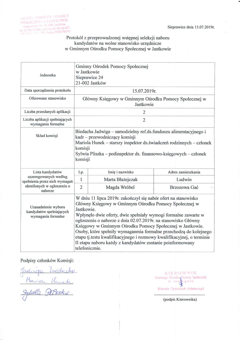 PROTOKÓŁ Z PRZEPROWADZONEJ WSTĘPNEJ SELEKCJI NABORU KANDYDATÓW NA WOLNE STANOWISKO URZĘDNICZE W GMINNYM OŚRODKU POMOCY SPOŁECZNEJ W JASTKOWIE