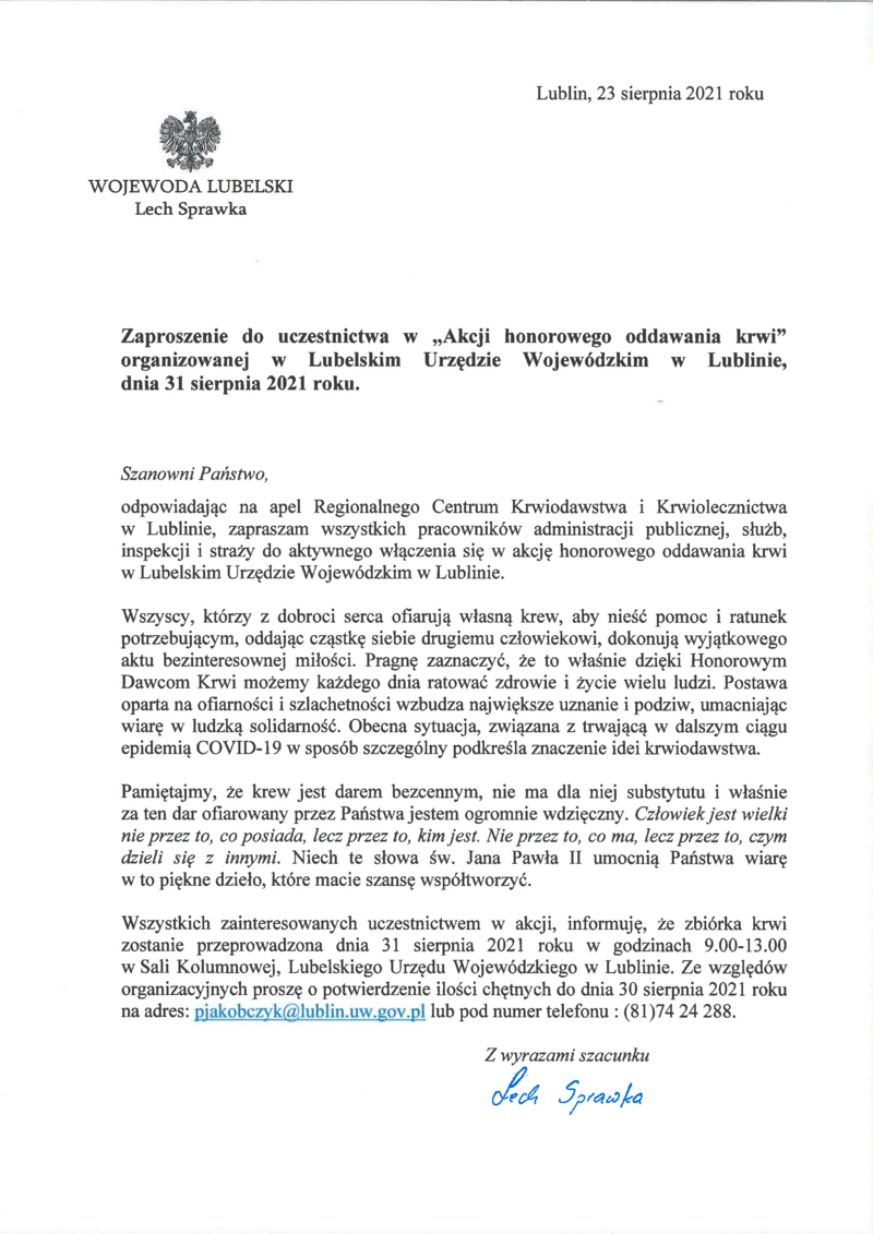 W DNIU 31.08.2021 R. (WTOREK), W GODZINACH 9.00-13.00, SALI KOLUMNOWEJ LUBELSKIEGO URZĘDU WOJEWÓDZKIEGO, UL. SPOKOJNA 4, ODBĘDZIE SIĘ AKCJA HONOROWEGO ODDAWANIA KRWI.