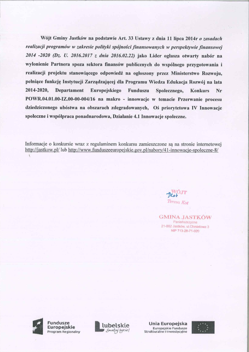 Wójt Gminy Jastków na podstawie Art. 33 Ustawy z dnia 11 lipca 2014r o zasadach realizacji programów w zakresie polityki spójności finansowanych w perspektywie finansowej 2014 -2020 (Dz. U. 2016.2017 z dnia 2016.02.22) jako Lider ogłasza otwarty nabór na wyłonienie Partnera spoza sektora finansów publicznych do wspólnego przygotowania i realizacji projektu stanowiącego odpowiedź na ogłoszony przez Ministerstwo Rozwoju, pełniące funkcję Instytucji Zarządzającej dla Programu Wiedza Edukacja Rozwój na lata 2014-2020, Departament Europejskiego Funduszu Społecznego, Konkurs Nr POWR.04.01.00-IZ.00-00-004/16 na makro - innowacje w temacie Przerwanie procesu dziedziczonego ubóstwa na obszarach zdegradowanych, Oś priorytetowa IV Innowacje społeczne i współpraca ponadnarodowa, Działanie 4.1 Innowacje społeczne.