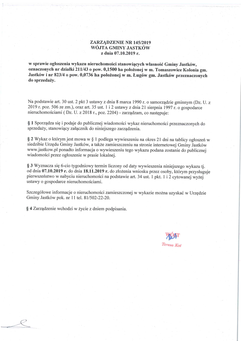 Zarządzenie nr 145/2019 Wójta Gminy Jastków z dnia 07.10.2019 r. w sprawie ogłoszenia wykazu nieruchomości stanowiących własność Gminy Jastków oznaczonych nr działki 211/43 o pow. 0,1500 ha położonej w m. Tomaszowice Kolonia gm. Jastków i nr 823/4 o pow. 0,0736 ha położonej w m. Ługów gm. Jastków przeznaczonych do sprzedaży.