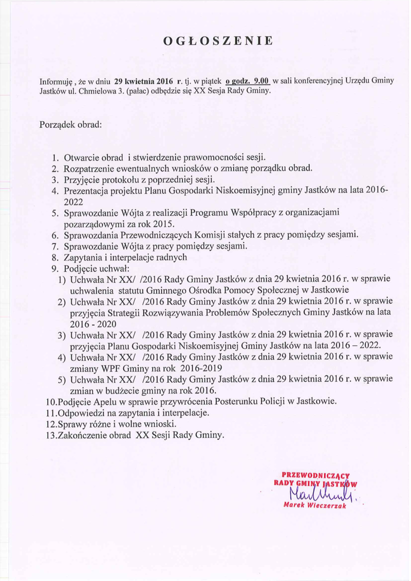 ZAPRASZAMY NA XX SESJĘ RADY GMINY JASTKÓW, KTÓRA ODBĘDZIE SIĘ DNIA 29.04.2016 R.
