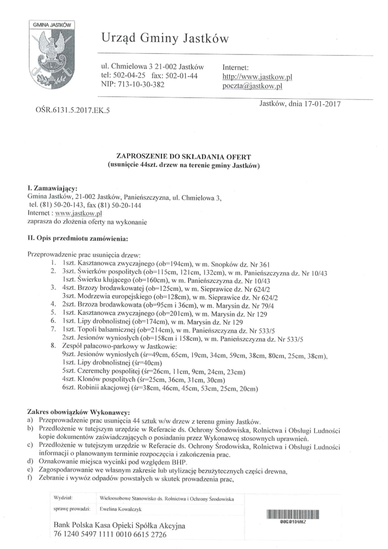 Zaproszenie do składania ofert  na wykonanie prac usunięcia 44 sztuk drzew na terenie gminy Jastków w terminie  do 28 lutego 2017r.