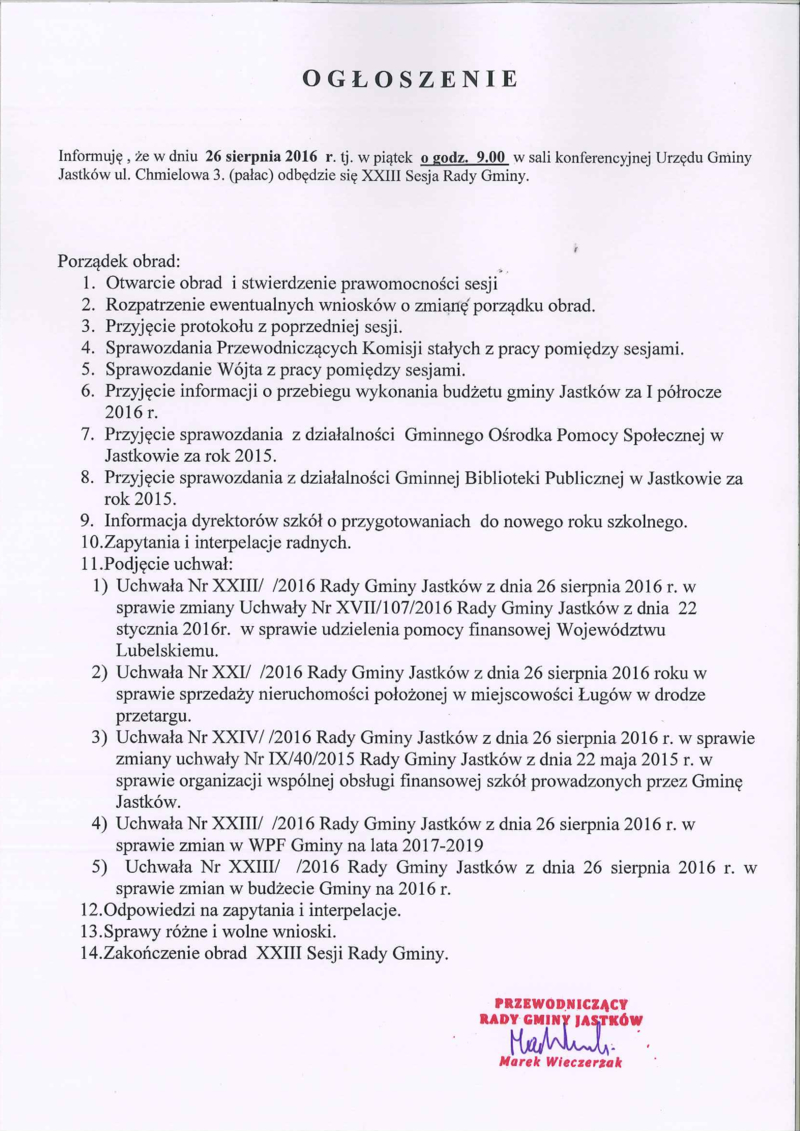 Zapraszamy na XXIII Sesję Rady Gminy Jastków w dniu 26 sierpnia 2016r. o godzinie 9.00
