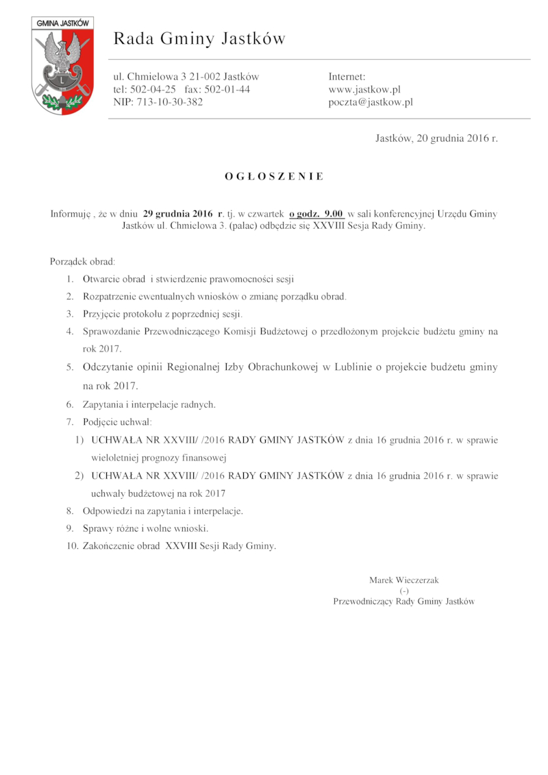 ZAPROSZENIE NA XXVIII SESJĘ RADY GMINY JASTKÓW W DNIU 29 GRUDNIA 2016
