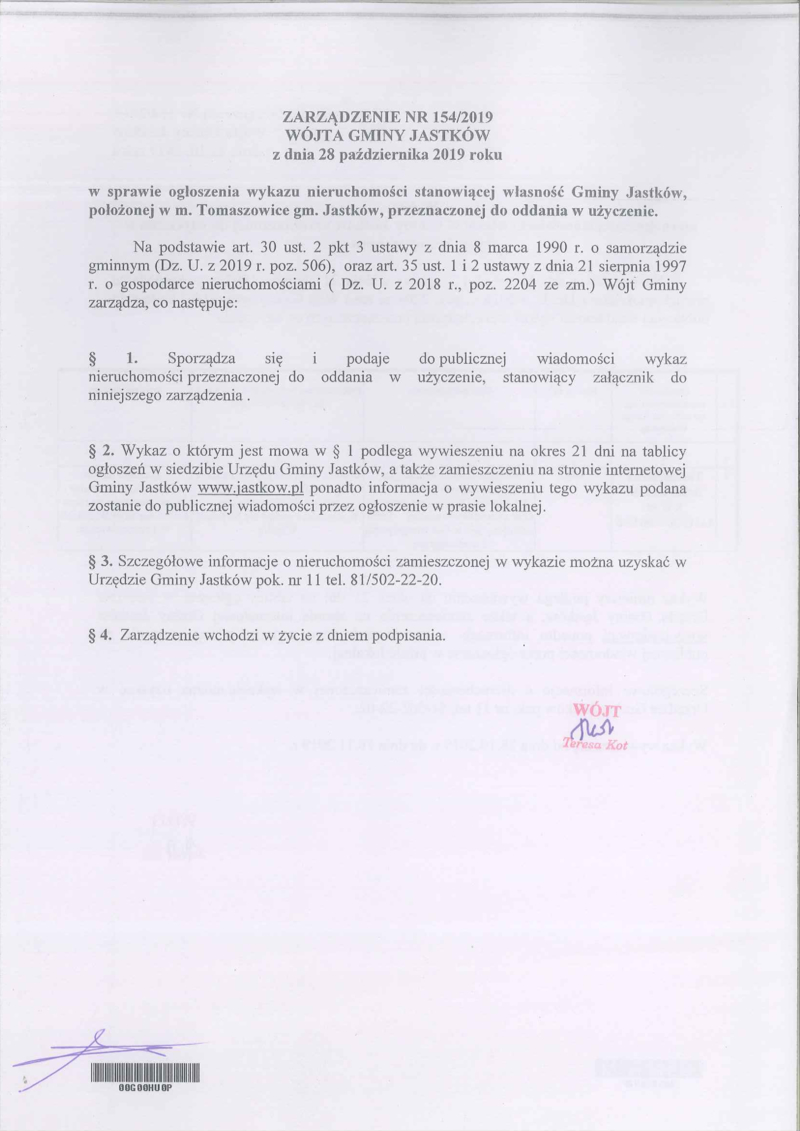 ZARZĄDZENIE NR 154/2019 WÓJTA GMINY JASTKÓW Z DNIA 28 PAŹDZIERNIKA 2019 ROKU