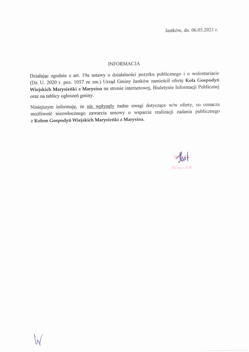 INFORMACJA DOTYCZĄCA WPŁYNIĘCIA/NIE WPŁYNIĘCIA UWAG DO OFERTY ZŁOŻONEJ PRZEZ KOŁO GOSPODYŃ WIEJSKICH MARYSIEŃKI Z MARYSINA