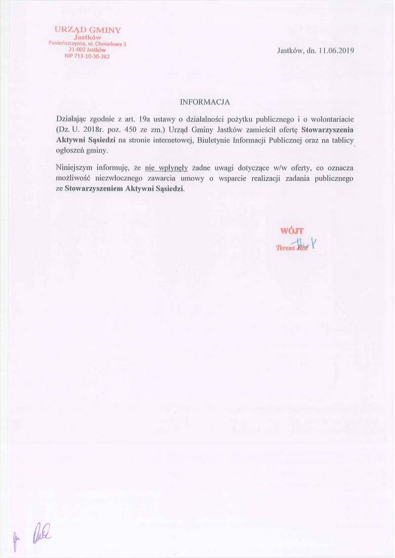 INFORMACJA DOTYCZĄCA WPŁYNIĘCIA/NIE WPŁYNIĘCIA UWAG DO OFERTY ZŁOŻONEJ PRZEZ STOWARZYSZENIE AKTYWNI SĄSIEDZI
