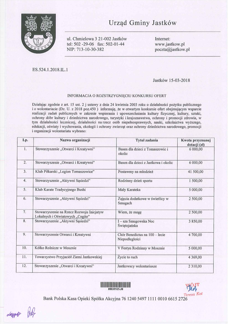 INFORMACJA O ROZSTRZYGNIĘCIU KONKURSU OFERT NA WSPARCIE WYKONANIA ZADAŃ PUBLICZNYCH W ROKU 2018 PRZEZ ORGANIZACJE PROWADZĄCE DZIAŁALNOŚĆ POŻYTKU PUBLICZNEGO NA TERENIE GMINY JASTKÓW