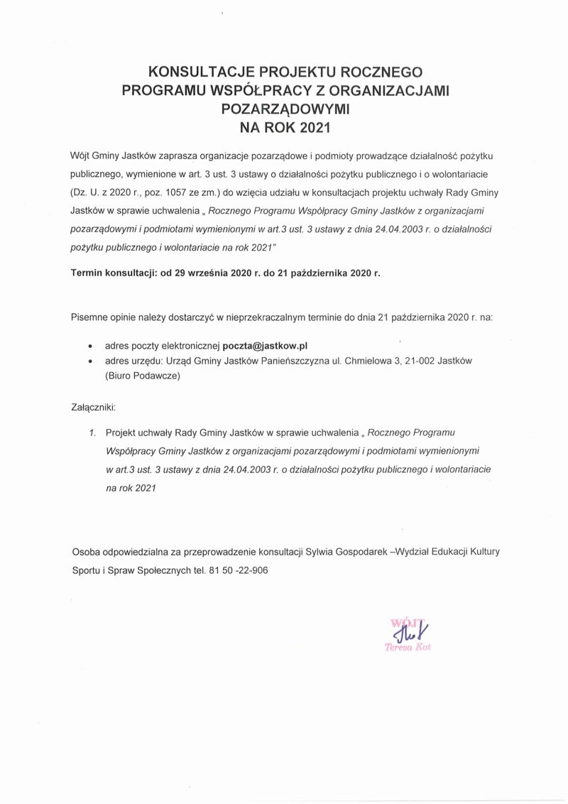 KONSULTACJE PROJEKTU ROCZNEGO PROGRAMU WSPÓŁPRACY Z ORGANIZACJAMI POZARZADOWYMI NA ROK 2021