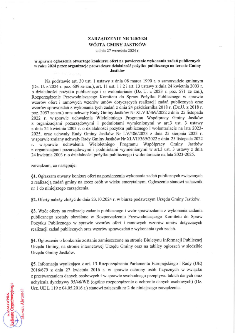 - ZARZĄDZENIE NR 140/2024 WÓJTA GMINY JASTKÓW z dnia 27 września 2024 r. w sprawie ogłoszenia otwartego konkursu ofert na powierzenie wykonania zadań publicznych w roku 2024 przez organizacje prowadzące działalność pożytku publicznego na terenie Gminy Jastków 02 paź 2024 — 3,04 MB