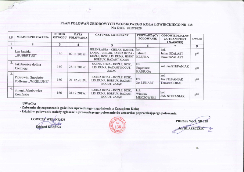 Plan polowań zbiorowych  Wojskowego Koła Łowieckiego nr 138 na rok 2019/2020