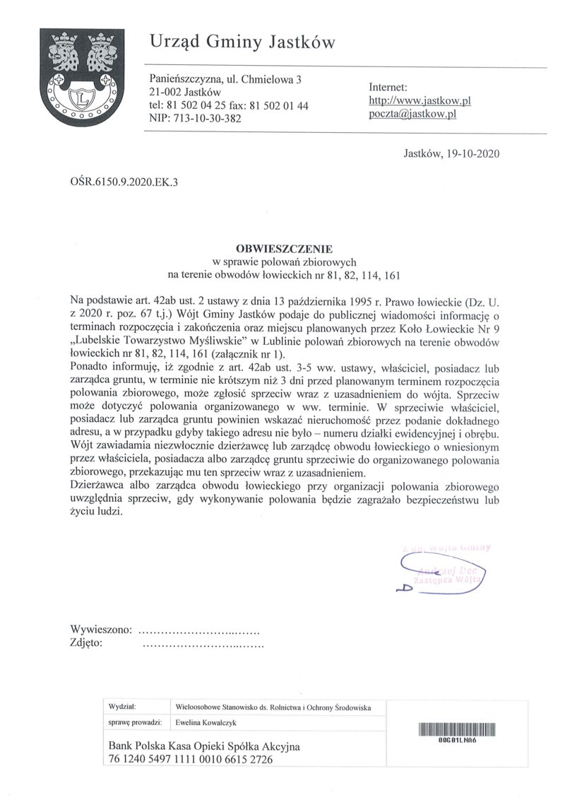 OBWIESZCZENIE W SPRAWIE POLOWAŃ ZBIOROWYCH.