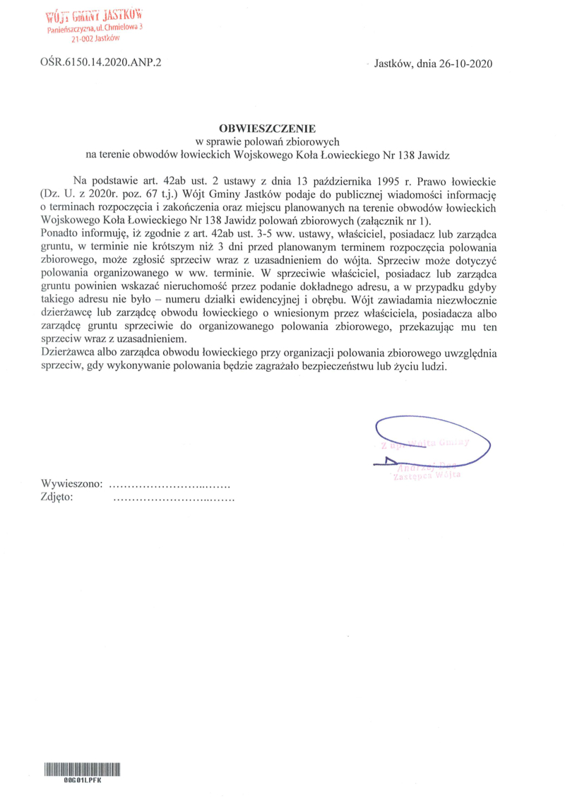 OBWIESZCZENIE W SPRAWIE POLOWAŃ ZBIOROWYCH.