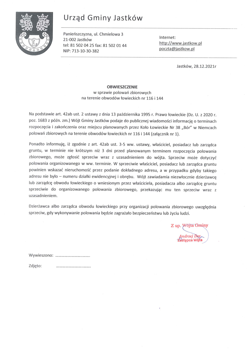 OBWIESZCZENIE WÓJTA GMINY JASTKÓW Z DNIA 28.12.2021 R. W SPRAWIE POLOWAŃ ZBIOROWYCH W SEZONIE 2021/2022