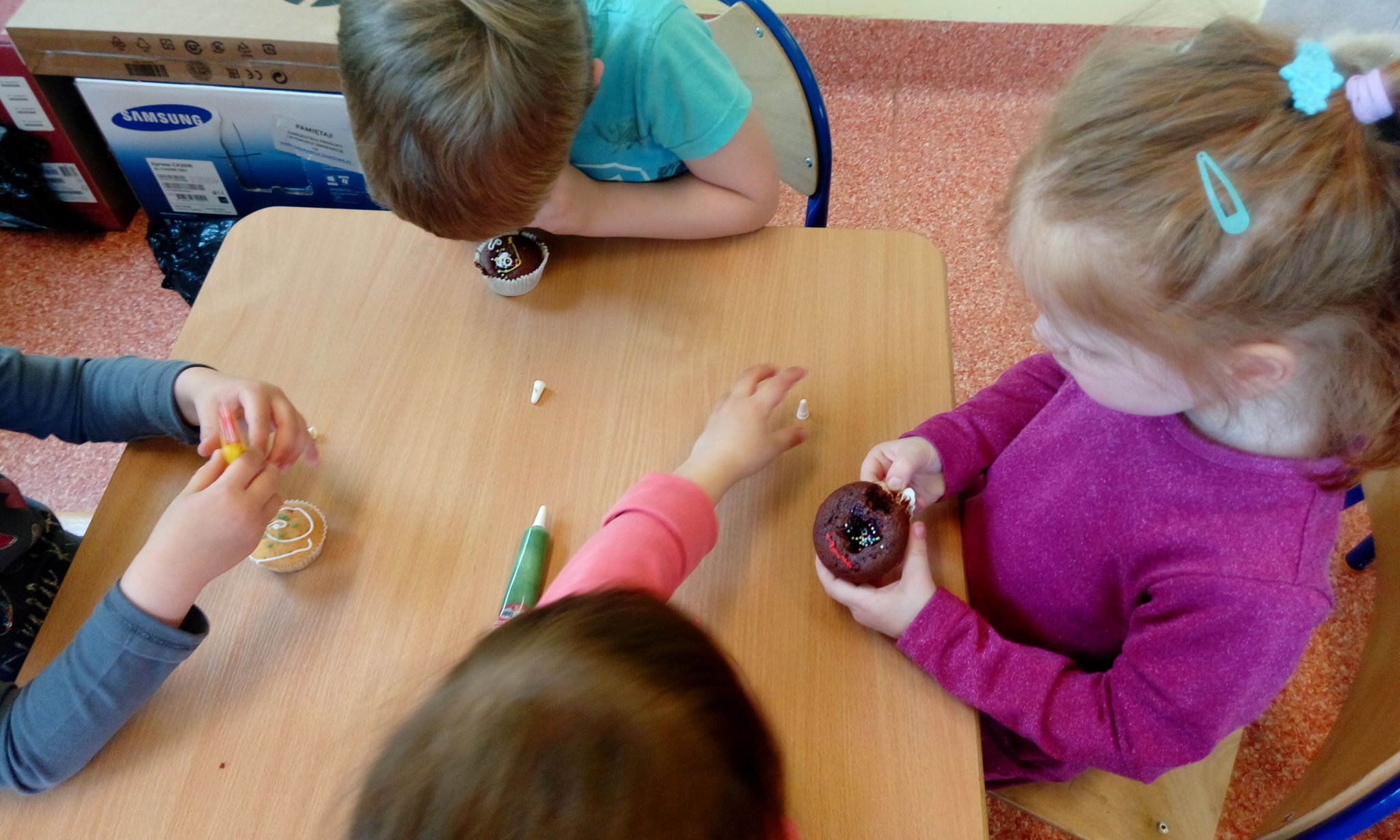 piekarniku, obserwowaliśmy proces rośnięcia ciasta i rozmawialiśmy dlaczego tak się dzieje. Gdy babeczki już się upiekły, wspólnie dekorowaliśmy je posypką, lukrem i kolorowymi pisakami. Była to świetna zabawa, każdy miał swój pomysł na babeczkę. Na koniec nastąpiła najlepsza część zajęć, a mianowicie degustowanie :)