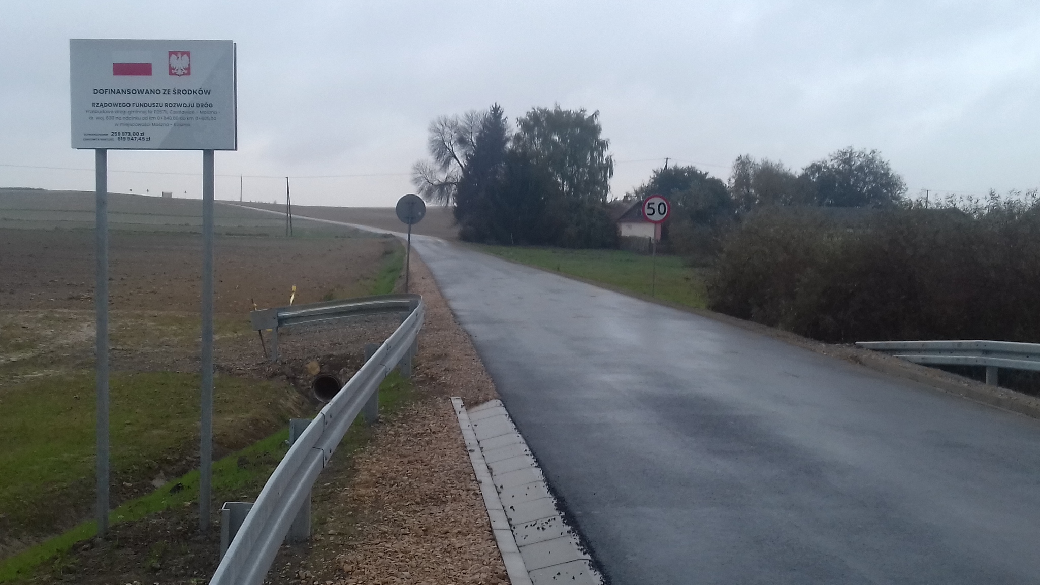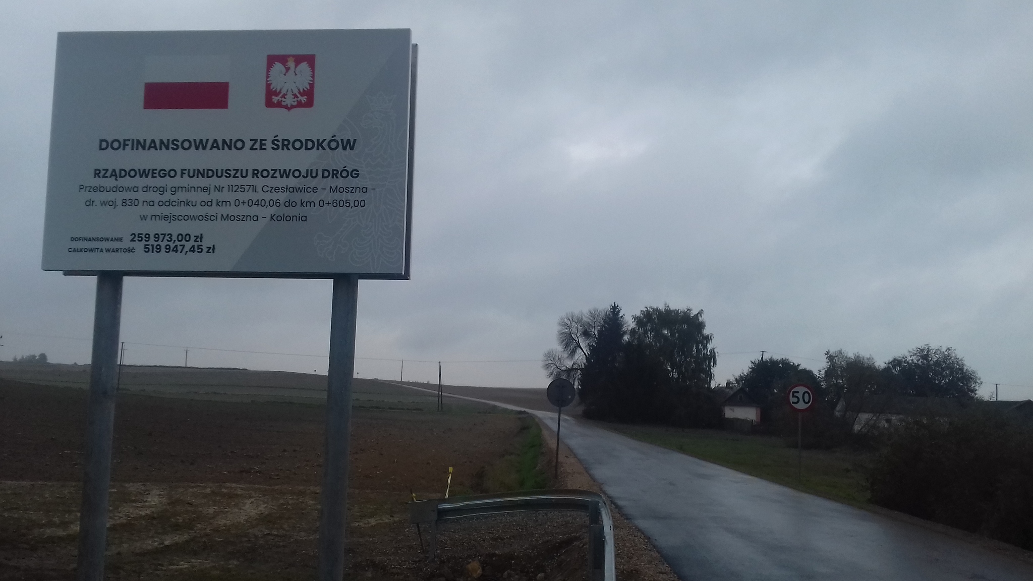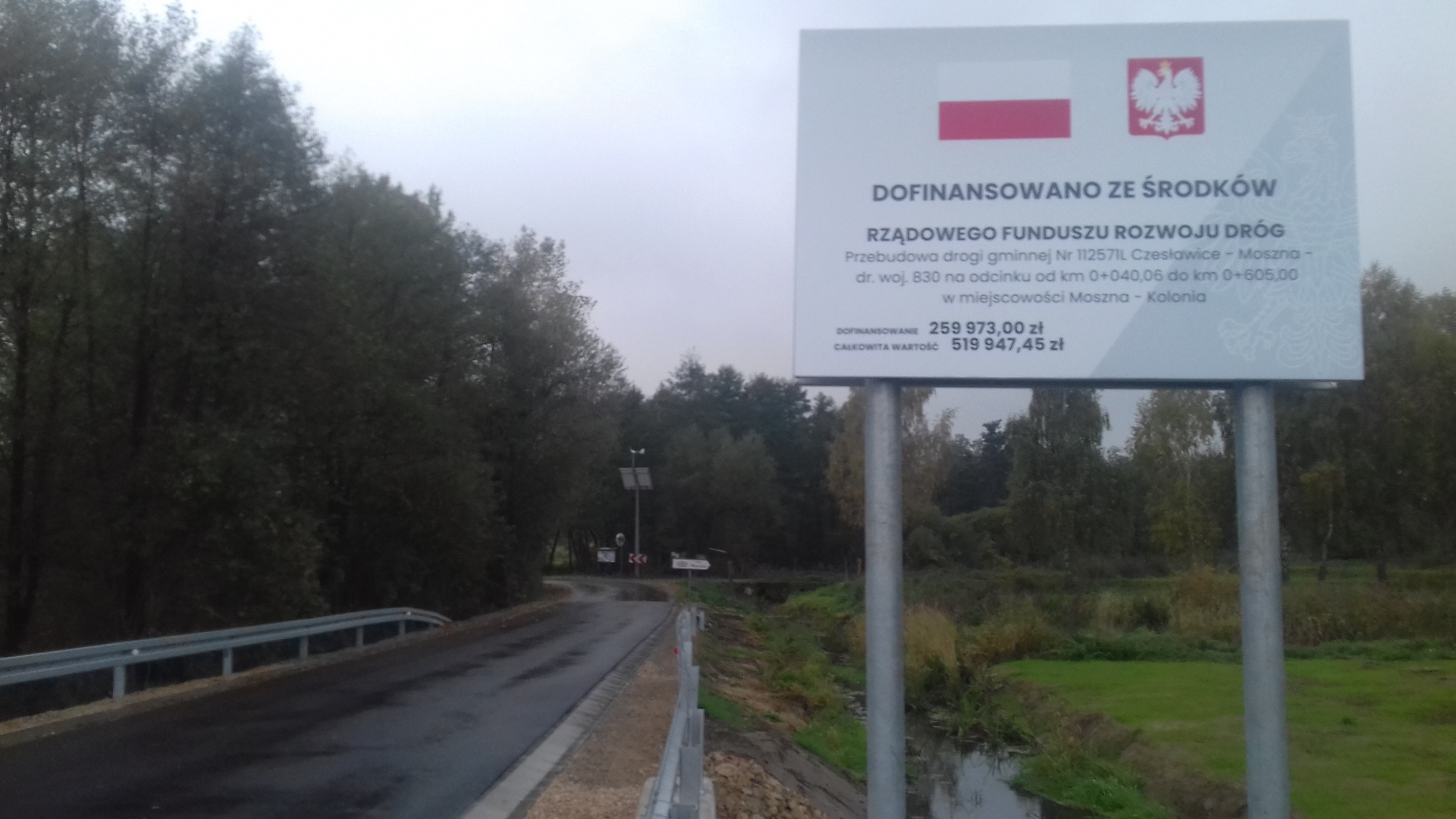 Foto Nr 3. Tablica informacyjna dla zadania pt. „Przebudowa drogi gminnej Nr 112571L Czesławice – Moszna – dr. woj. 830 na odcinku od km 0+040,06 do km 0+605,00 w miejscowości Moszna-Kolonia”.