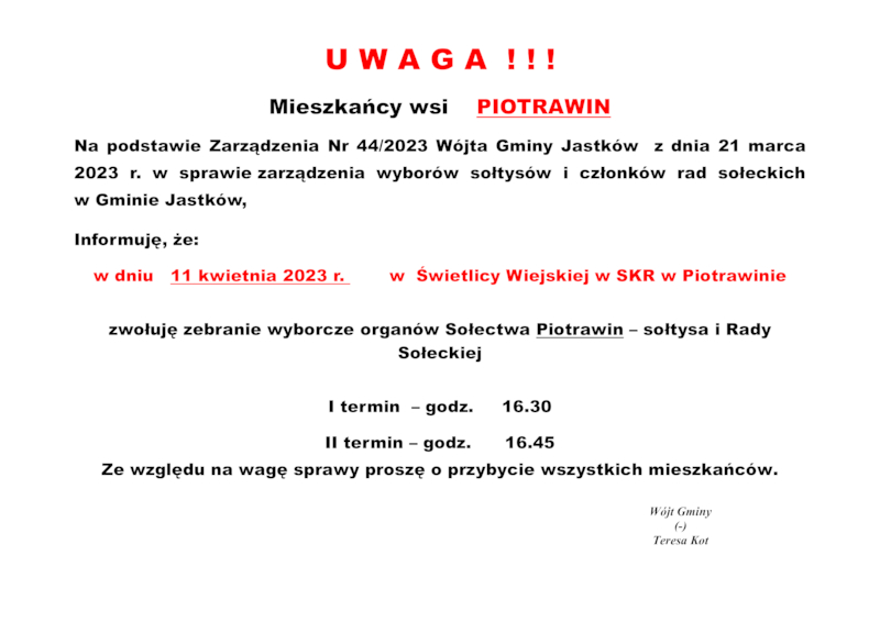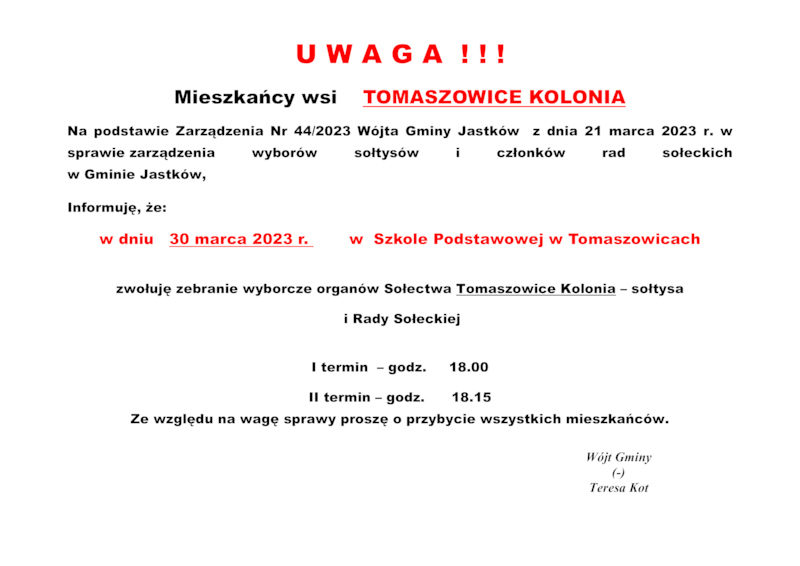 INFORMACJE WÓJTA GMINY JASTKÓW O TERMINACH WYBORÓW NA SOŁTYSA ORAZ RADY SOŁECKIEJ W SOŁECTWACH GMINY JASTKÓW