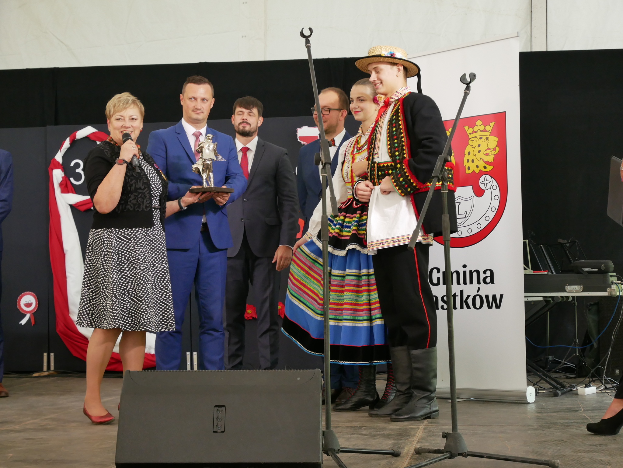 Wójt Gminy Teresa Kot wraz z Przewodniczącym Rady Gminy Markiem Wieczerzakiem dokonali wręczenia przedstawicielom Zespołu Pieśni i Tańca statuetkę okolicznościową. Autorem statuetki jest pan Dariusz Fluder – artysta rzeźbiarz specjalizujący się w pracy m.in. z metalem oraz drewnem. Praca przedstawia parę tańczącą w ludowym stroju krzczonowskim (lubelskim) wyłaniającą się z arabskiej pięćdziesiątki umieszczonej na dębowym, postarzanym cokoliku w formie desek estradowych. Uchwycony układ taneczny postaci sprawia, że nie ma ona swojego początku ani końca. Jest więc wizualną pętlą zaklętą w tańcu.