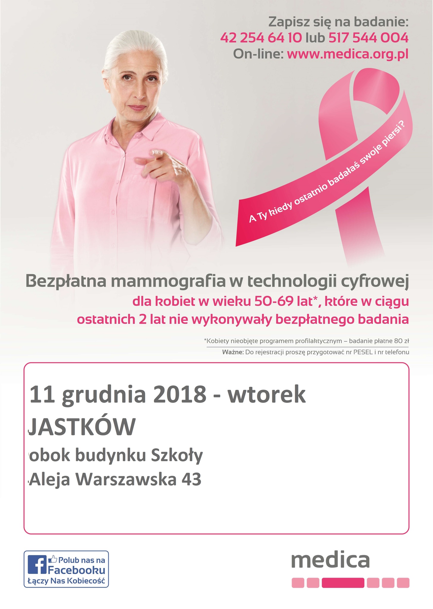Dla kobiet w wieku 50-69lat*, które w ciągu ostatnich 2 lat nie wykonywały bezpłatnego badania. 11 grudnia 2018 r. - wtorek - Jastków obok budynku Szkoły Aleja Warszawska 43