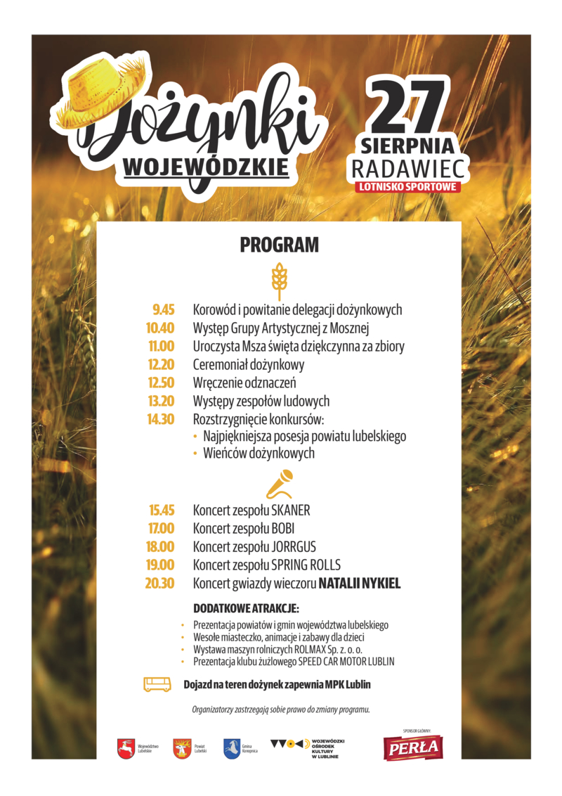 W niedzielę 27 sierpnia 2017 roku odbyły się Dożynki Wojewódzkie w Radawcu. Przedstawiamy fotorelację z wydarzenia. Warto dodać, że tegoroczną Starościną dożynek była Pani Grażyna Pietrak Sołtys Wsi Moszna, zaś dożynkowy obrzęd "przekazania chleba" zaprezentowała Grupa Artystyczna z Mosznej. Tegoroczne stoisko promujące Gminę Jastków przygotowały Panie z Kół Gospodyń Wiejskich z Miłocina i Mosznej. O oprawę muzyczną korowodu oraz stoiska zadbał Zespół Pieśni i Tańca Dąbrowica.