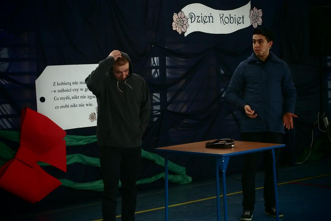 Wszystko to z okazji "Dnia Kobiet" zorganizowanego przez Gminny Ośrodek Kultury i Sportu w Jastkowie zs. w Dąbrowicy. Na uroczystość zaproszone zostały panie Radne Gminy Jastków na czele z panią Teresą Kot, Wójtem Gminy Jastków, panie sołtyski oraz członkinie Kół Gospodyń Wiejskich. Świętowanie rozpoczęli panowie: Kamil Ziółkowski (dyr. GOKiS), Marek Wieczerzak (Przewodniczący RG) i Andrzej Dec (Z-ca wójta), którzy złożyli zebranym kobietom życzenia samych szczęśliwych chwil!!! Program w tym roku był nader bogaty. Już od samego rana można było podziwiać piękno tańców ludowych w wykonaniu grupy młodzieżowej Zespołu Pieśni i Tańca "Dąbrowica", występy kabaretowe uczniów klasy VI SP w Płouszowicach oraz niebywale przystojnych panów z kabaretu "Trzecia Strona Medalu". Czterech mężczyzn i jedna gitara... Podczas "Dnia Kobiet" zaprezentowali znakomity program kabaretowy włączając czynnie do zabawy nasze gospodynie... oczarowując ich męskim wdziękiem i obdarowując nie tylko swym uśmiechem...