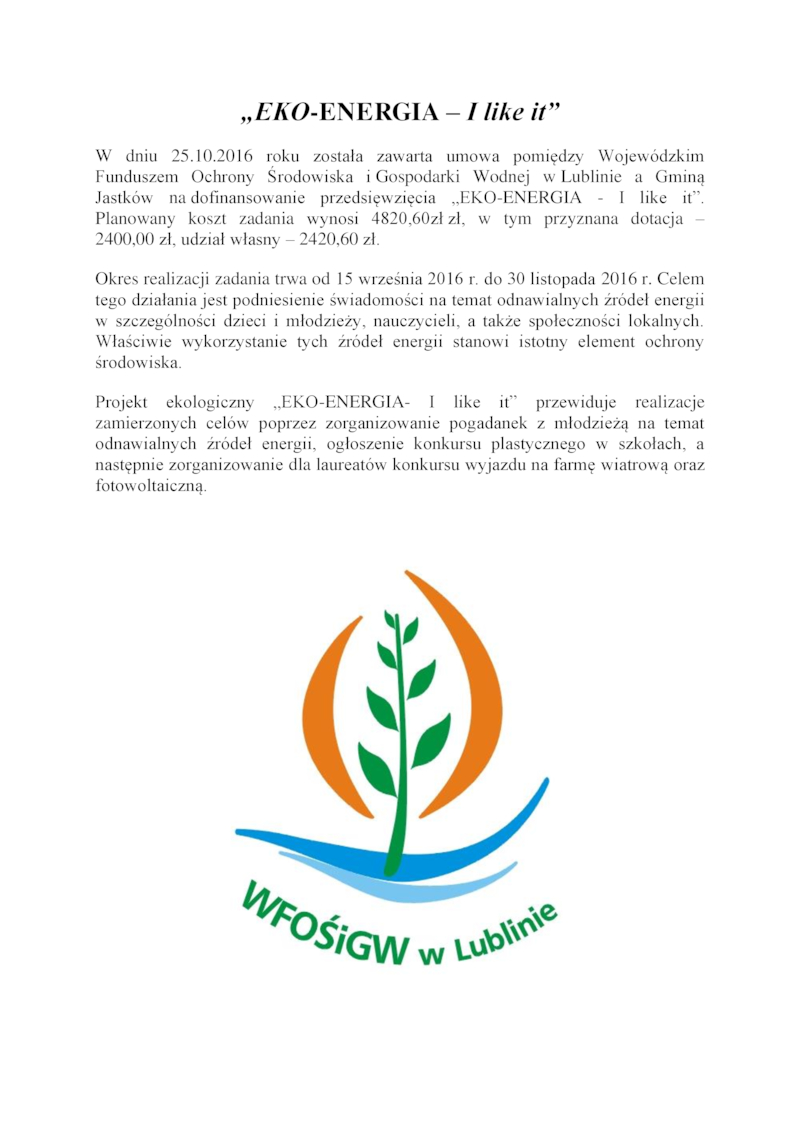 W dniu 25.10.2016 roku została zawarta umowa pomiędzy Wojewódzkim Funduszem Ochrony Środowiska i Gospodarki Wodnej w Lublinie a Gminą Jastków na dofinansowanie przedsięwzięcia „EKO-ENERGIA - I like it”. Planowany koszt zadania wynosi 4820,60zł zł, w tym przyznana dotacja – 2400,00 zł, udział własny – 2420,60 zł.