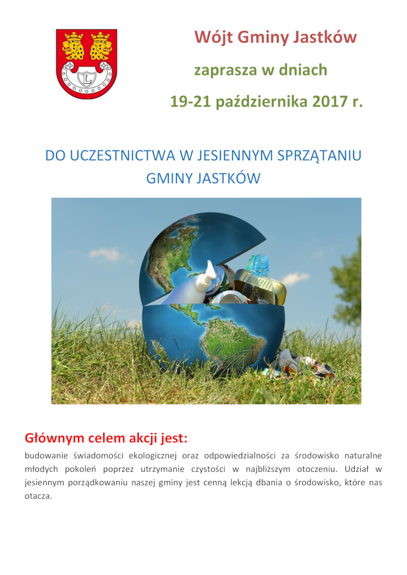 Wójt Gminy Jastków zaprasza w dniach 19 - 21 października 2017 r.  do uczestnictwa akcji pn. Jesienne sprzątanie Gminy Jastków.