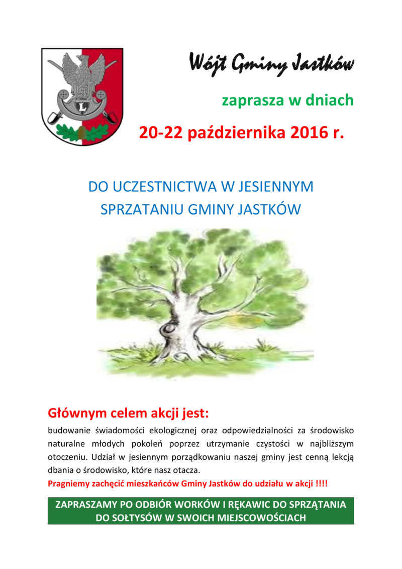 Wójt Gminy Jastków zaprasza w dniach 20-22 października 2016 r. do uczestnictwa w jesiennym sprzataniu Gminy Jastków