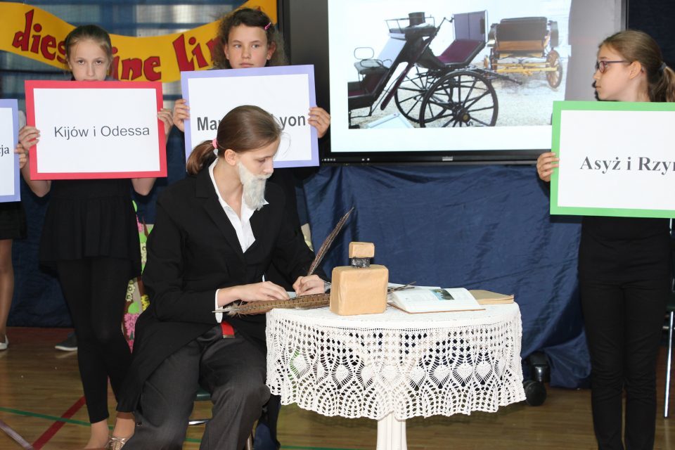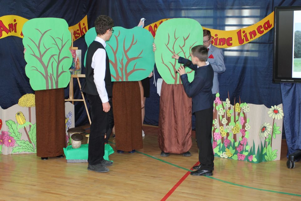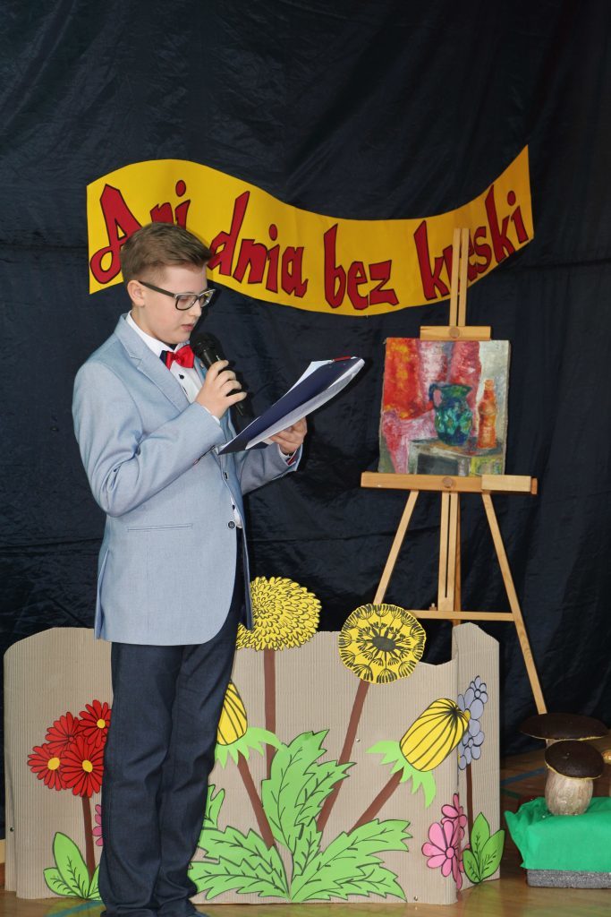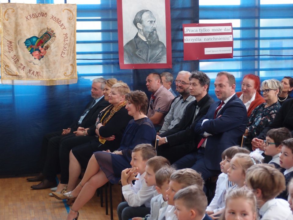 Potem, już w szkole, odbyła się część artystyczna. Rozpoczęły ją najmłodsze dzieci - z oddziałów przedszkolnych, które wykonały piosenkę o żabach i bocianach. Następnie odśpiewano dwa hymny - państwowy oraz szkoły (wykonany tego dnia po raz pierwszy, autorstwa pani Marii Szkutnik - tekst i pana Aleksandra Resiaka - muzyka). Później zgromadzeni goście mogli zapoznać się z prezentacją na temat historii szkoły, z sylwetką patrona - Józefa Ignacego Kraszewskiego (w inscenizacji ukazującej jego dzieciństwo, młodość, pracę i pasje wzięło udział 46 uczniów z klasy IV-VII) oraz obejrzeć krótki film o szkole współcześnie. Na koniec kolorowy akcent - występ grupy cyrkowej prowadzonej przez panią Beatę Madej.