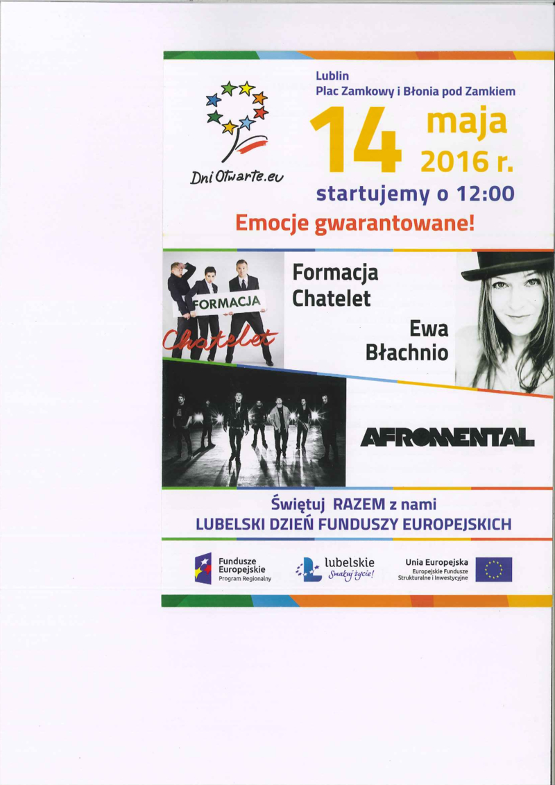Ponadto w dniu 14 maja br. na Placu Zamkowym w Lublinie oraz na Błoniach pod Zamkiem odbędzie się Lubelski Dzień Funduszy Europejskich.