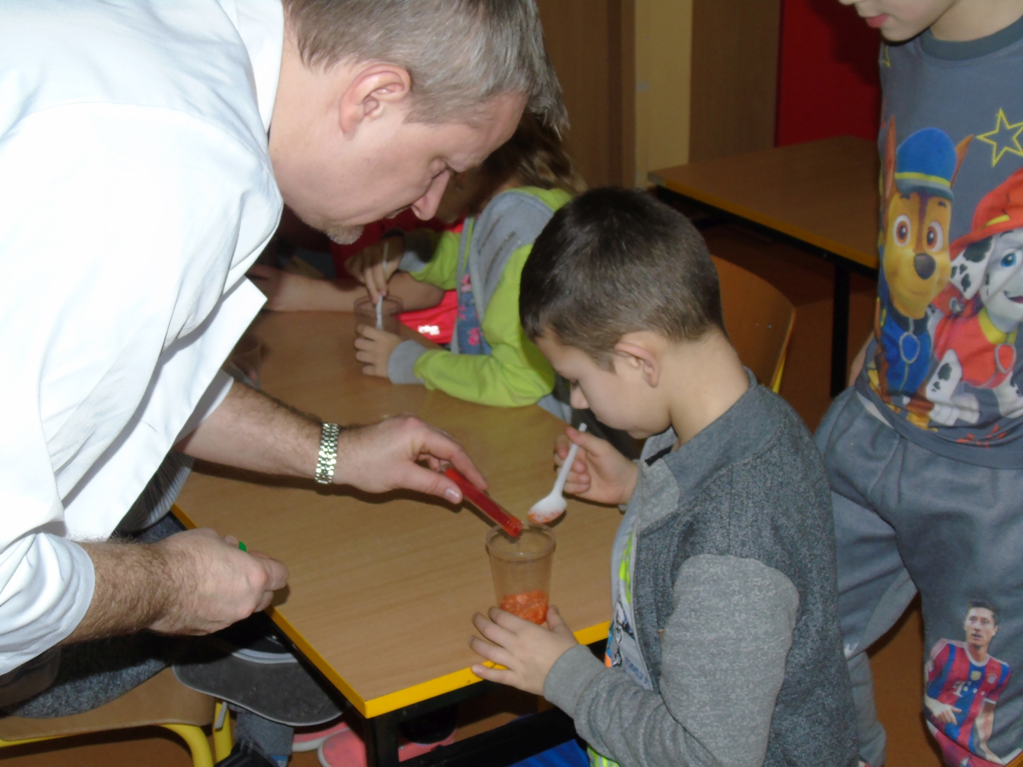 Kolejna przygoda, którą miały okazje przeżyć dzieci podczas ferii, wiązała się z wizytą w szkole firmy „Genimus” i naukowymi czarami. Uczniowie w roli prawdziwych naukowców tworzyli manufakturę soli kąpielowych. Pani Iwona i pan Robert uczyli, jak z najprostszych składników przygotować pachnące sole do kąpieli. Na koniec każdy zabrał ze sobą pięknie opakowaną pamiątkę. Tego dnia również dzieci miały okazję wyruszyć w podróż z prorokiem Jonaszem po starożytnej Niniwie. Razem z nim przeżywały rozterki i dramat wyrzucenia za burtę okrętu. Uczniowie, którzy wybrali zajęcia muzyczne, wspólnie z panem Adamem grali, śpiewali i bawili się przy ulubionej muzyce.