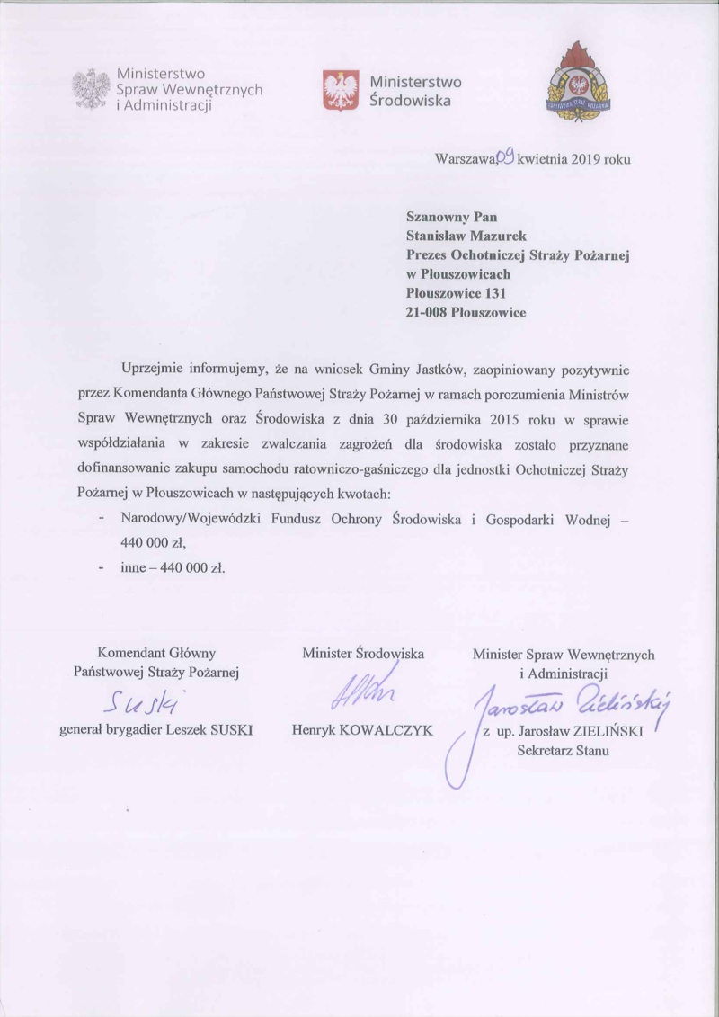 21 maja br. w Lubelskim Urzędzie Wojewódzkim odbyła się uroczystość  wręczenia promes na dofinansowanie zakupu samochodów ratowniczo-gaśniczych dla jednostek Ochotniczej Straży Pożarnej z terenu województwa lubelskiego. Przyznane środki finansowe zostaną wykorzystane na potrzeby zwalczania zagrożeń dla środowiska. Promesy wręczyli wicemarszałek Sejmu RP Beata Mazurek  oraz wojewoda lubelski Przemysław Czarnek. Z terenu Gminy Jastków dotację otrzymała Jednostka Ochotniczej Straży Pożarnej z Płouszowic w kwocie 880 000 zł.