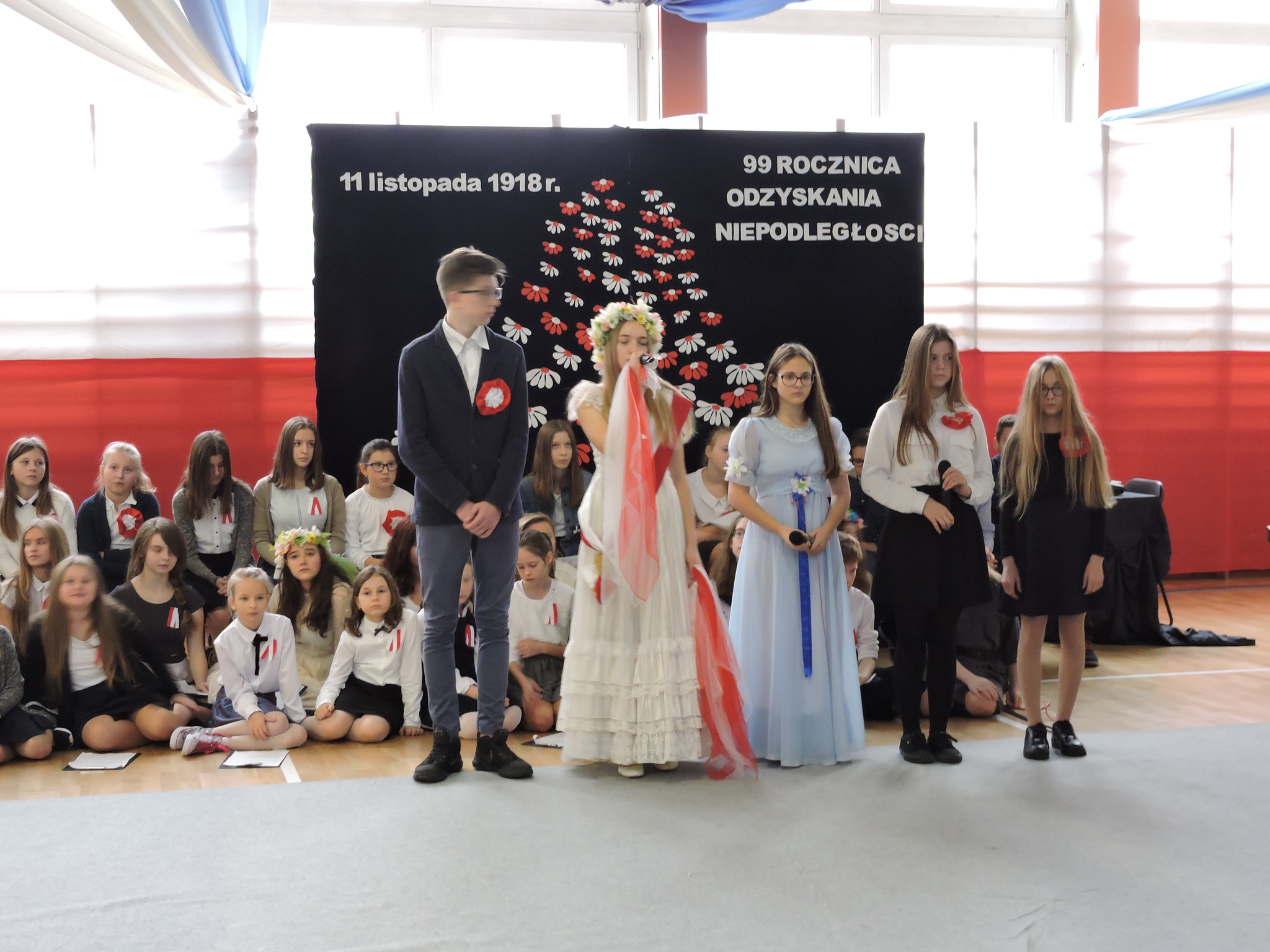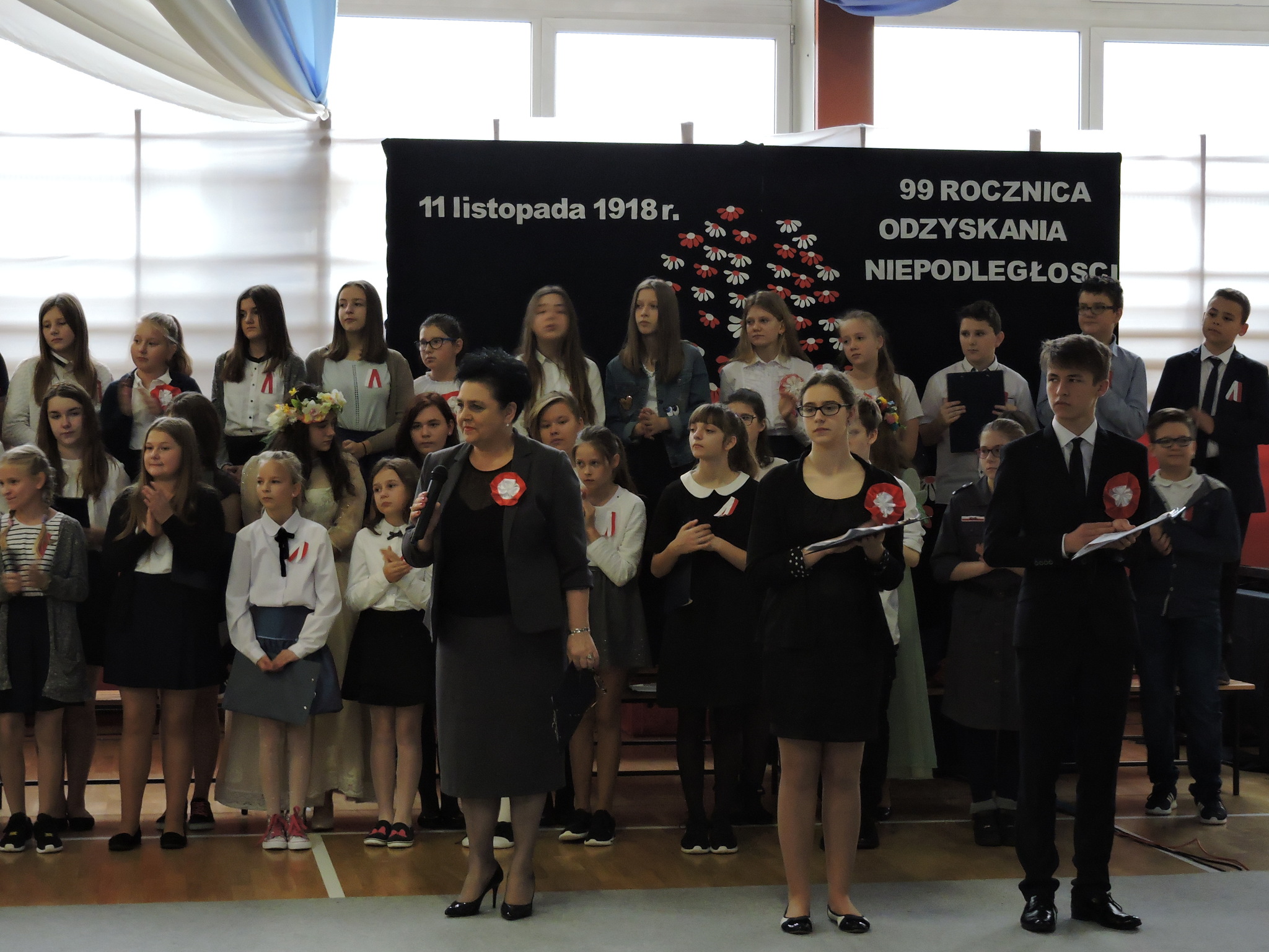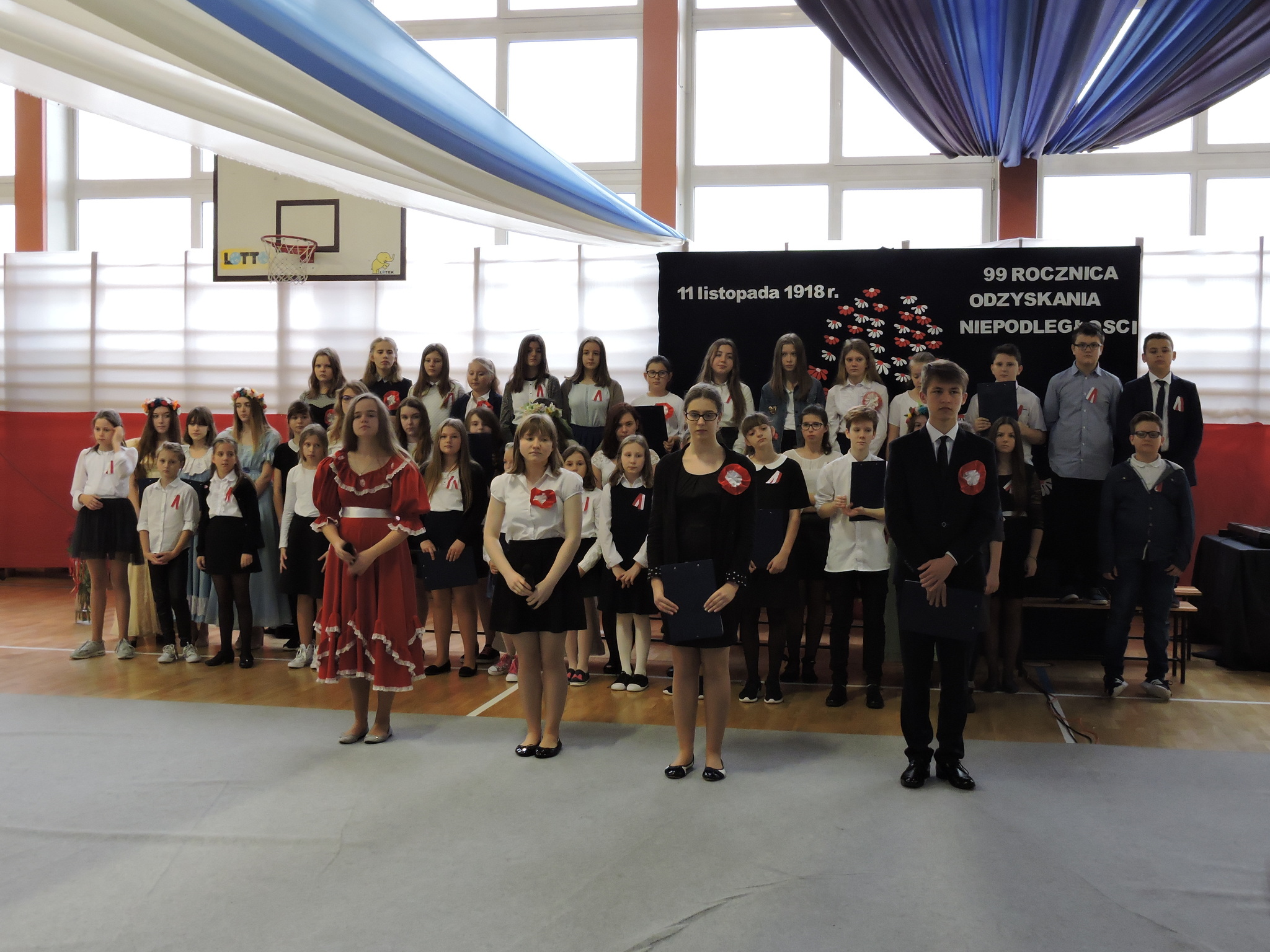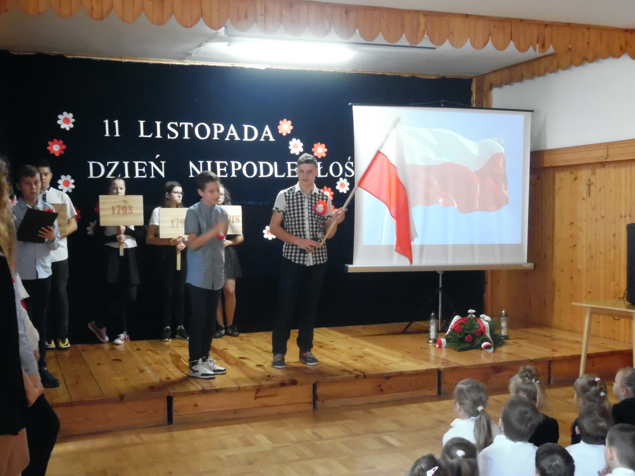 W dniu 9 listopada 2017 roku odbyła się pierwsza część uroczystości z okazji Święta Niepodległości. Uczniowie z klas 7B i 7C przedstawili swoim młodszym kolegom i koleżankom z oddziałów przedszkolnych i klas 1–3 wydarzenia historyczne związane z odzyskaniem niepodległości. Dzieci wysłuchały montażu słowno-muzycznego, podczas którego dowiedziały się jak przebiegały rozbiory Polski. Następnie przedstawiciele klas siódmych wraz z klasami młodszymi złożyli wieńce i zapalili znicze na Cmentarzu Legionistów aby uczcić pamięć Polaków walczących o naszą niepodległość. (Wioletta Guz – nauczyciel matematyki)
