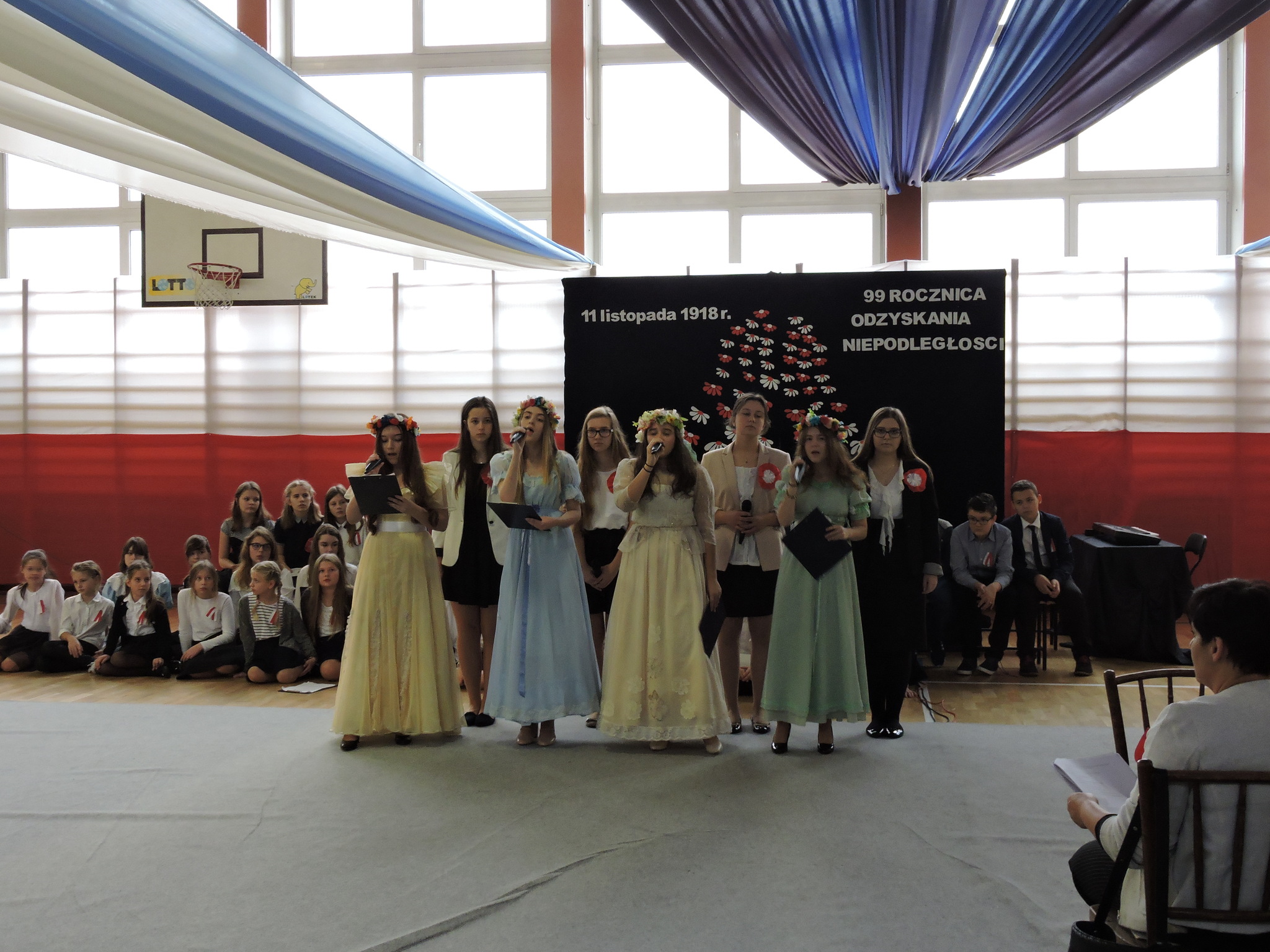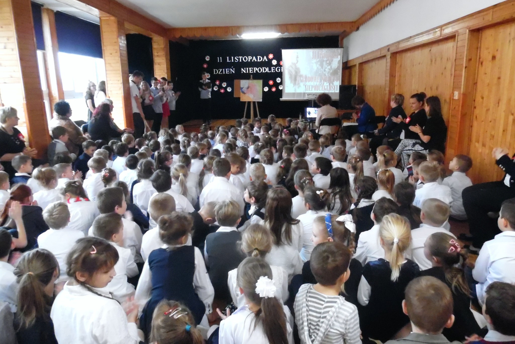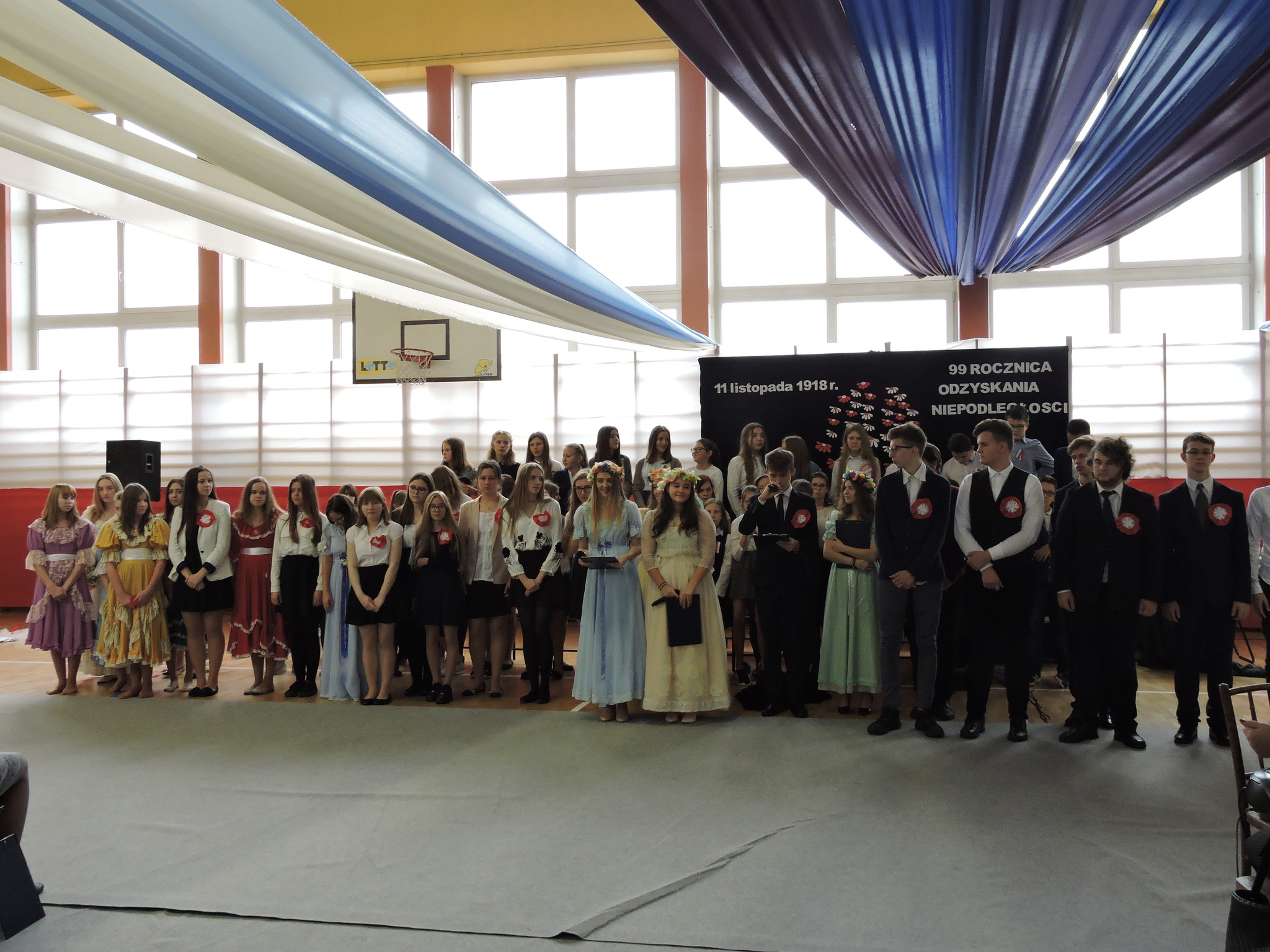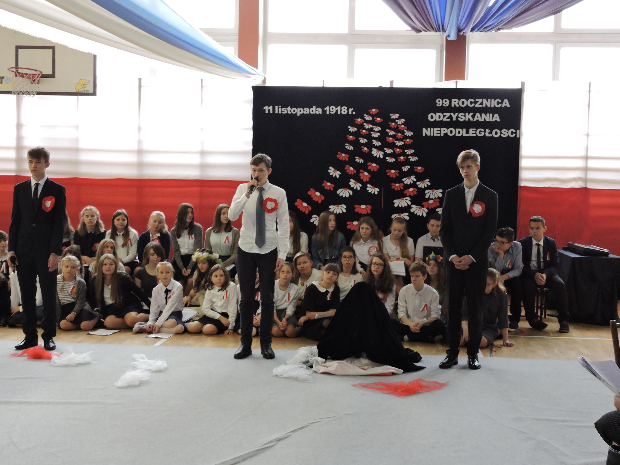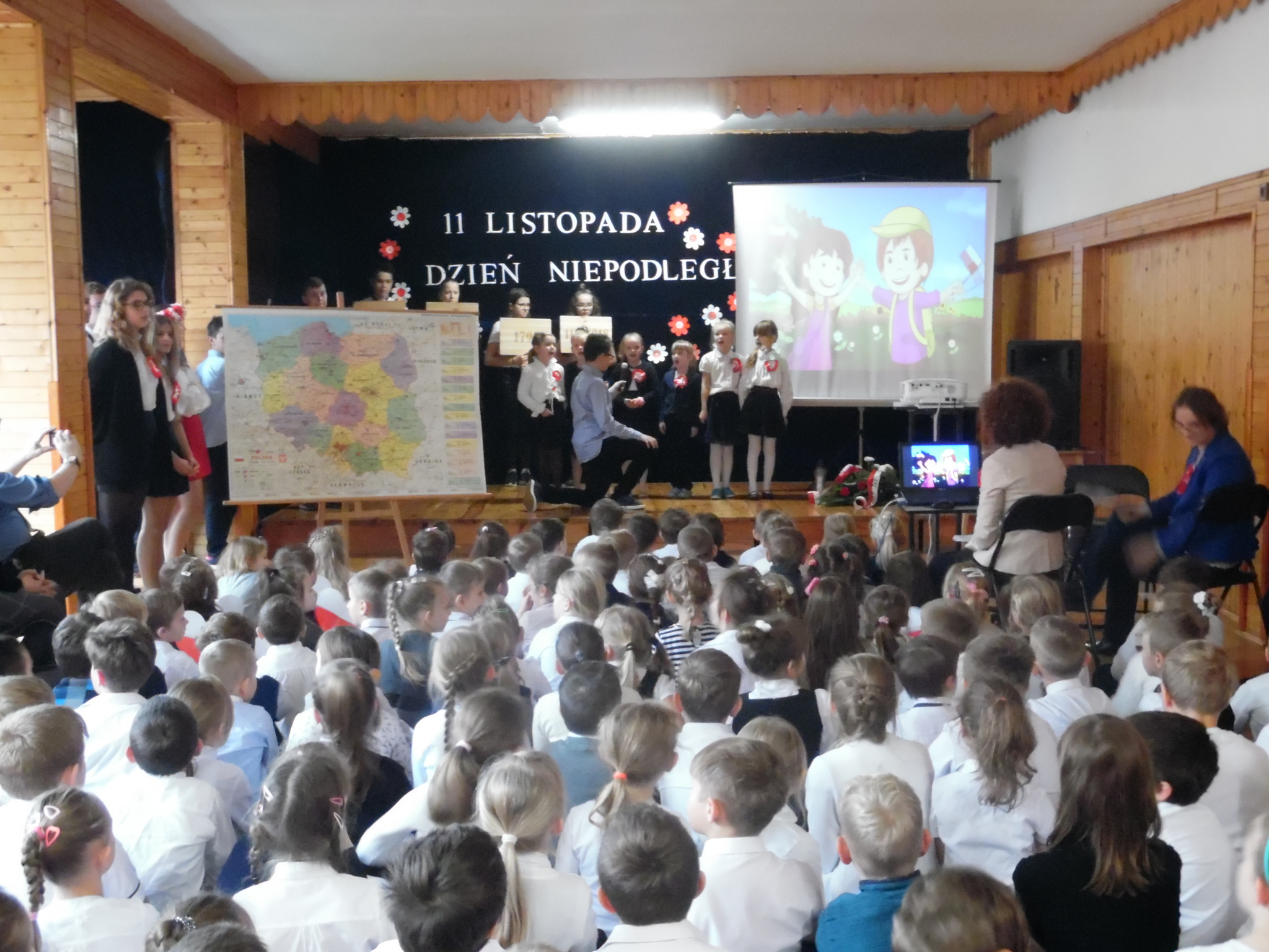 W dniu 9 listopada 2017 roku odbyła się pierwsza część uroczystości z okazji Święta Niepodległości. Uczniowie z klas 7B i 7C przedstawili swoim młodszym kolegom i koleżankom z oddziałów przedszkolnych i klas 1–3 wydarzenia historyczne związane z odzyskaniem niepodległości. Dzieci wysłuchały montażu słowno-muzycznego, podczas którego dowiedziały się jak przebiegały rozbiory Polski. Następnie przedstawiciele klas siódmych wraz z klasami młodszymi złożyli wieńce i zapalili znicze na Cmentarzu Legionistów aby uczcić pamięć Polaków walczących o naszą niepodległość. (Wioletta Guz – nauczyciel matematyki)