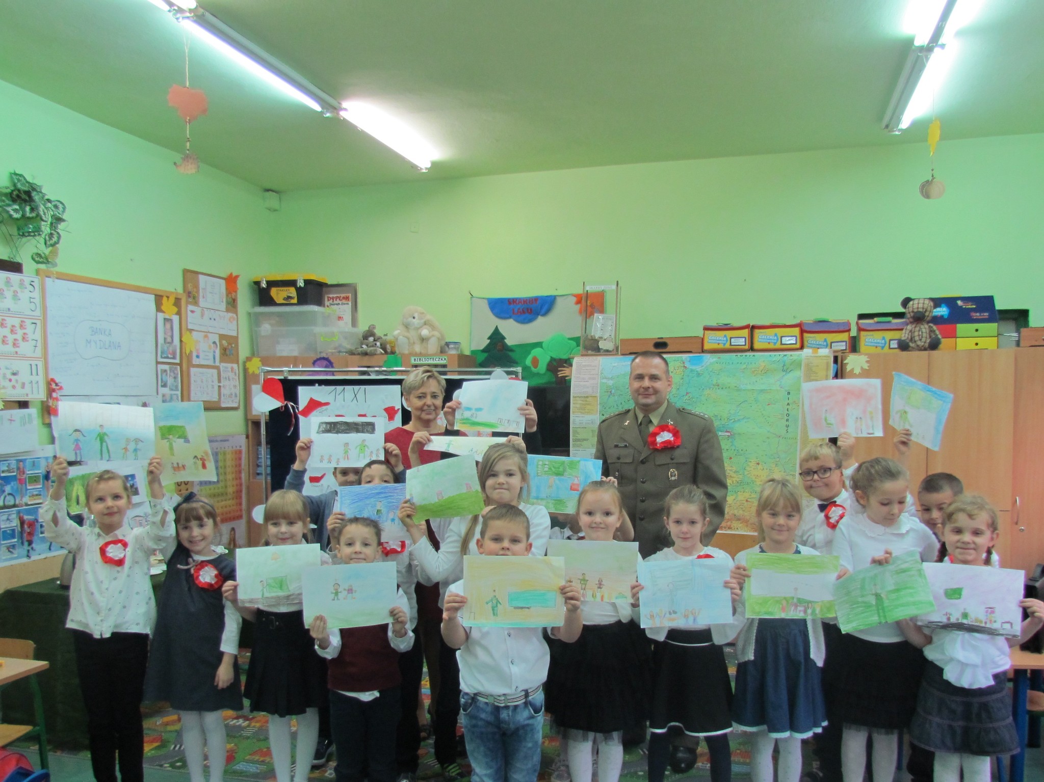 Również 10 listopada dzieci z klasy 1B gościły przedstawicieli Wojewódzkiego Sztabu Wojska Polskiego z Lublina. Było to bardzo ciekawe i fascynujące spotkanie. Pan kapitan Paweł Joński bardzo ciekawie opowiadał o swojej pracy w wojsku, o tym jak dzisiaj można zostać żołnierzem, jakie są tego plusy i minusy oraz jak wygląda codzienna służba. Dzieci zadawały panu kapitanowi wiele pytań. Chłopców szczególnie interesowała broń i wojskowy sprzęt. Dziewczynki były ciekawe, czy i one mogą służyć w wojsku. Poza tym dostojny gość zaprezentował swój piękny galowy mundur. Pani Monika Majchrzak, która pracuje w administracji sztabu, przybliżyła dzieciom między innymi wiedzę na temat rekrutacji do wojska czy też powoływania rezerwy. Oczywiście wszystkie dzieci w przyszłości zadeklarowały swoją służbę w wojsku. Ciekawym elementem spotkania było rysowanie przez kapitana na tablicy stopni wojskowych. Pan kapitan śmiał się, że ma okazję przypomnieć sobie jak to było, gdy sam był uczniem szkoły podstawowej. Na pamiątkę ciekawego spotkania dzieci otrzymały od gości upominki – długopisy i smycze w kolorach wojskowych oraz słodycze. Pierwszoklasiści wraz z wychowawczynią panią Ewą Maleszyk podziękowali gościom za przybycie. Po spotkaniu z dziećmi goście uczestniczyli w uroczystej akademii z okazji Święta Niepodległości. (Ewa Maleszyk – nauczyciel edukacji wczesnoszkolnej)