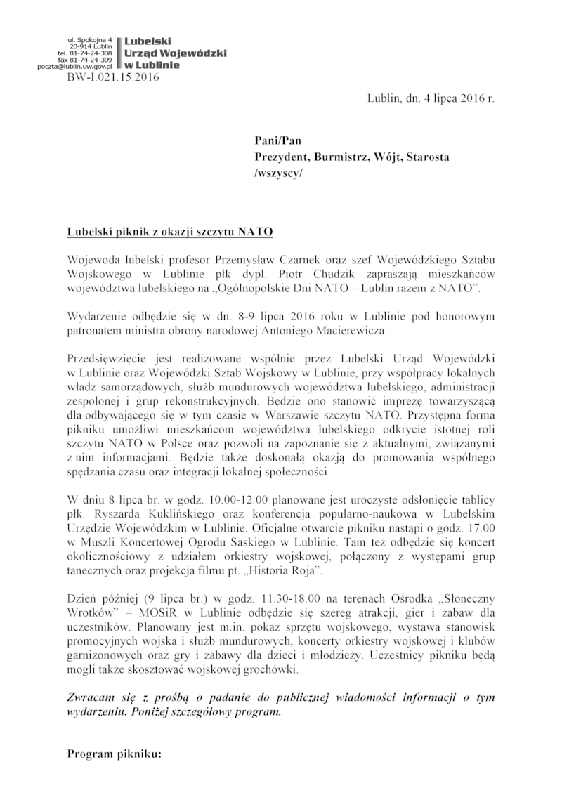 Wojewoda lubelski profesor Przemysław Czarnek oraz szef Wojewódzkiego Sztabu Wojskowego w Lublinie płk dypl. Piotr Chudzik zapraszają mieszkańców województwa lubelskiego na „Ogólnopolskie Dni NATO – Lublin razem z NATO”.