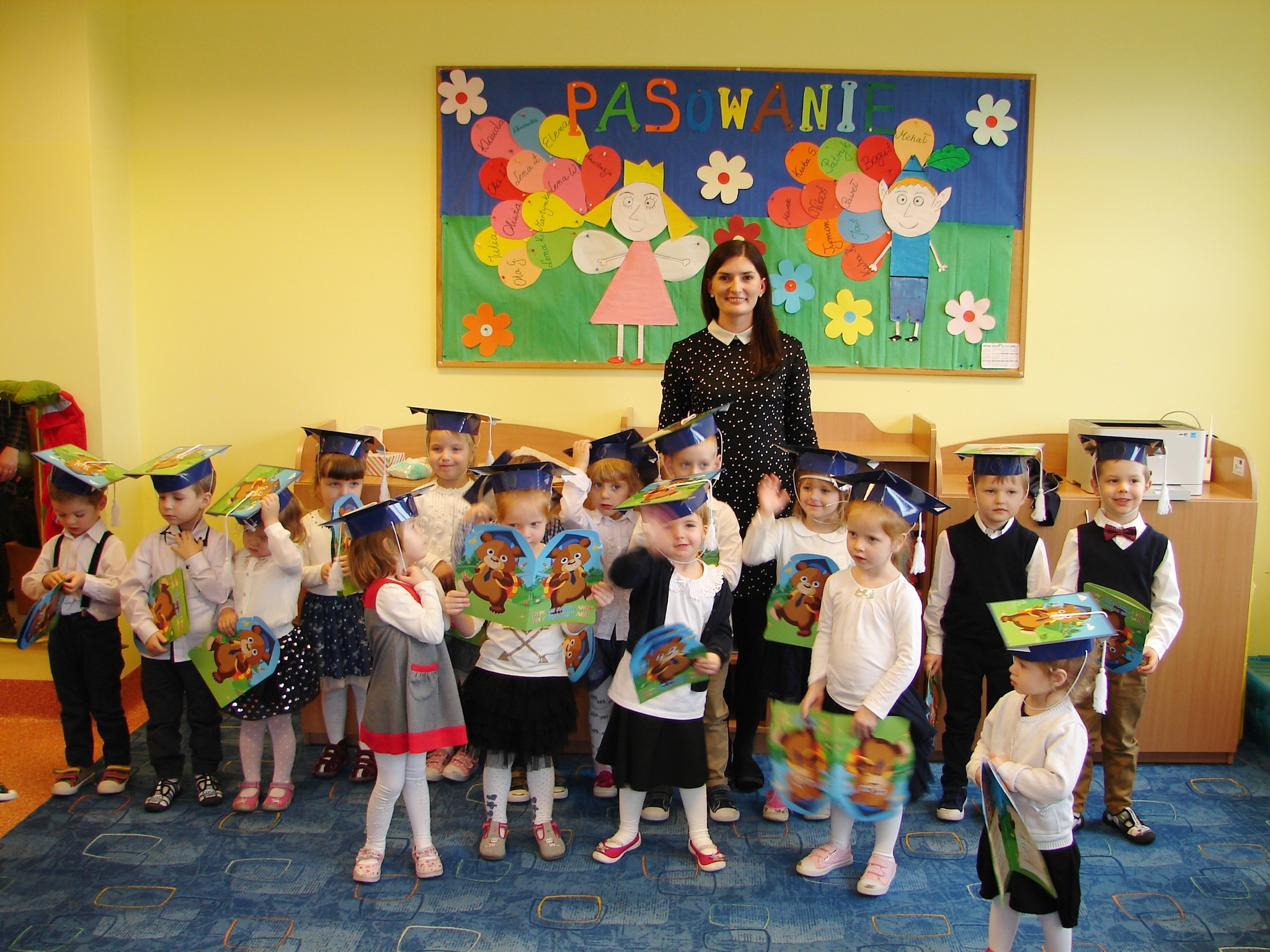 a także wystrój sali, podkreśliły doniosłość wydarzenia. Po części artystycznej dzieci złożyły ślubowanie, a następnie za pomocą zaczarowanego ołówka zostały pasowane na przedszkolaka. Na pamiątkę tej ważnej chwili każde dziecko otrzymało dyplom. Po części oficjalnej rodzice wraz