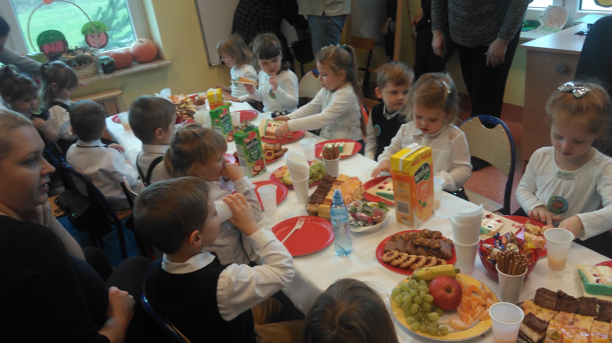 z dziećmi i gośćmi zostali zaproszeni do stołów na poczęstunek.