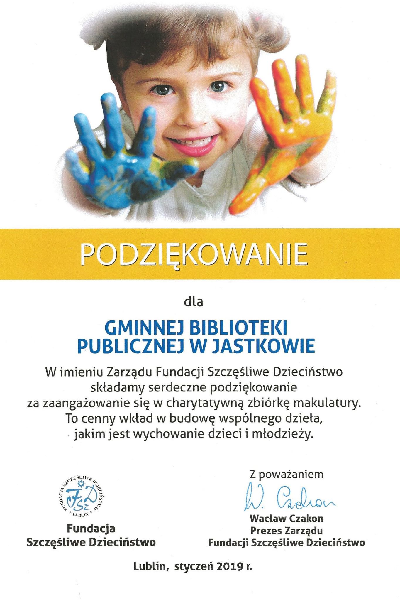 Pragniemy poinformować, że w wyniku zbiórki makulatury w naszej bibliotece, która odbyła się w dniach 30 listopada – 4 grudnia 2018 r. zebrano 2530 kg makulatury. Wszystkie środki finansowe uzyskane ze zbiórki zostały przekazane na fundusz stypendialny Skarbiec Dobrego Wychowania, z którego udzielane jest wsparcie dla zdolnej młodzieży i programu formacyjnego Akademia Młodzieżowa.