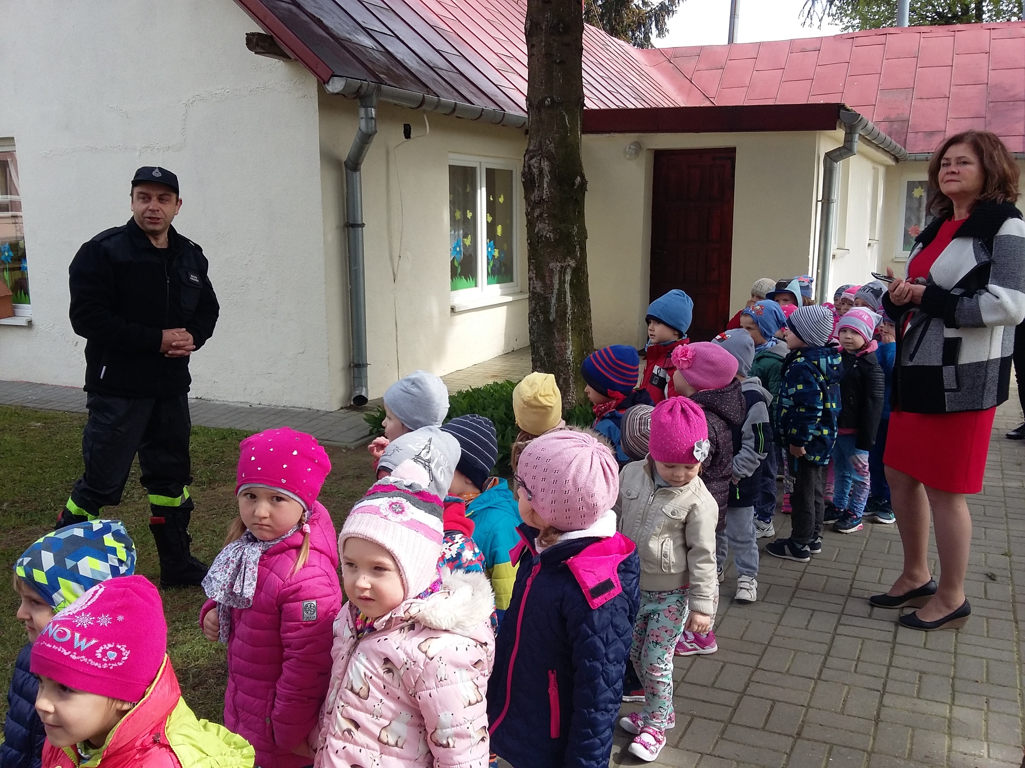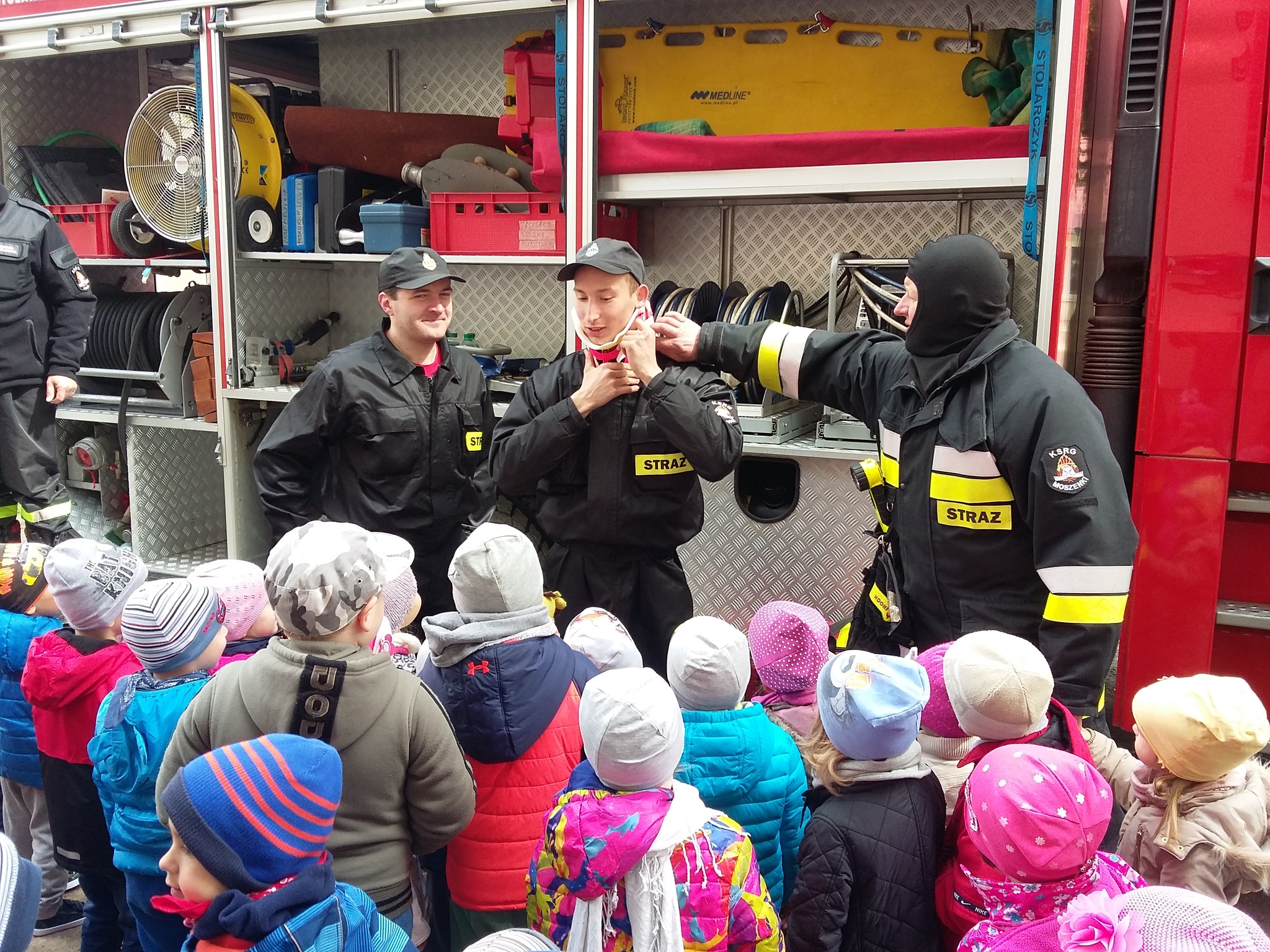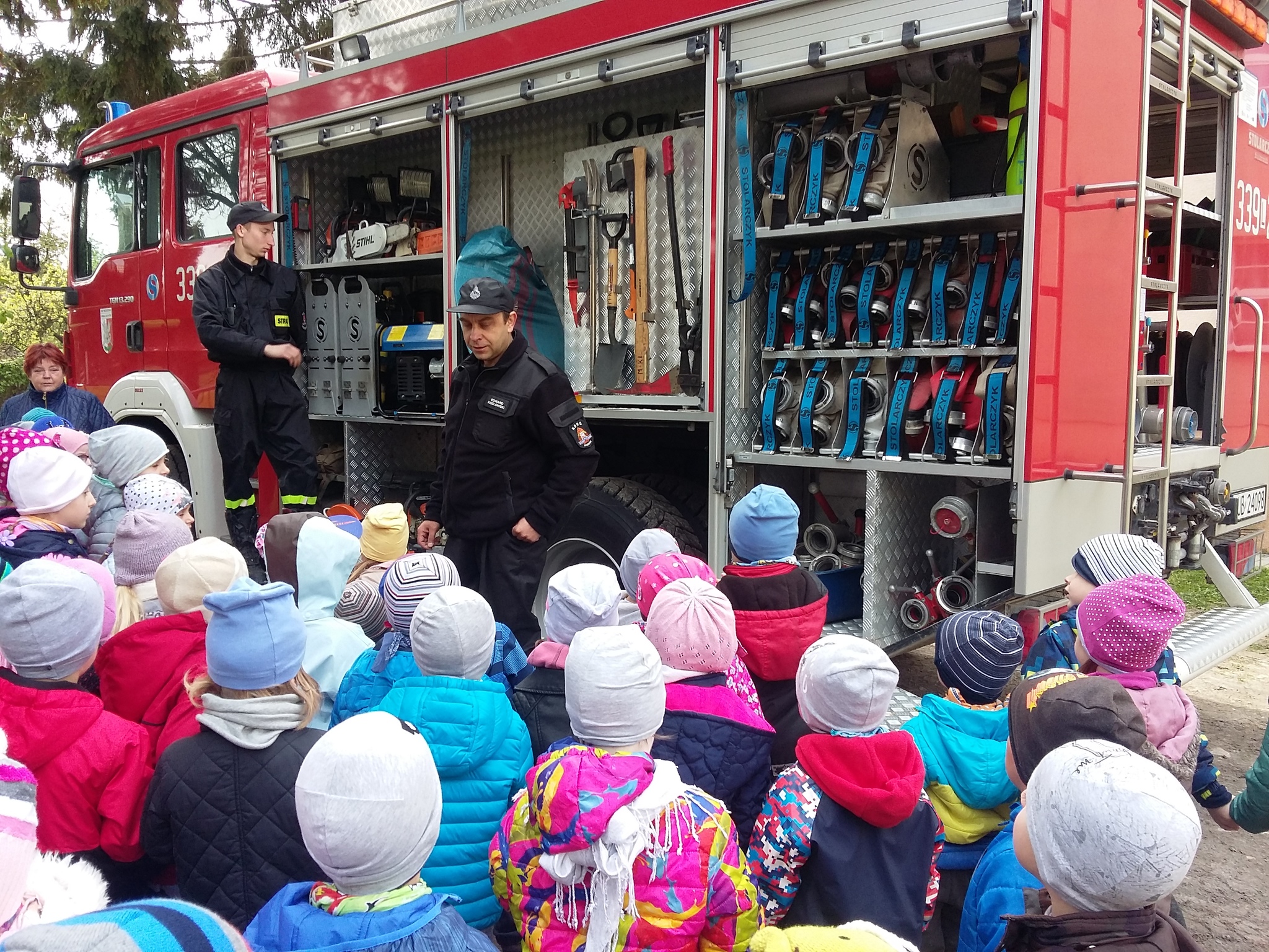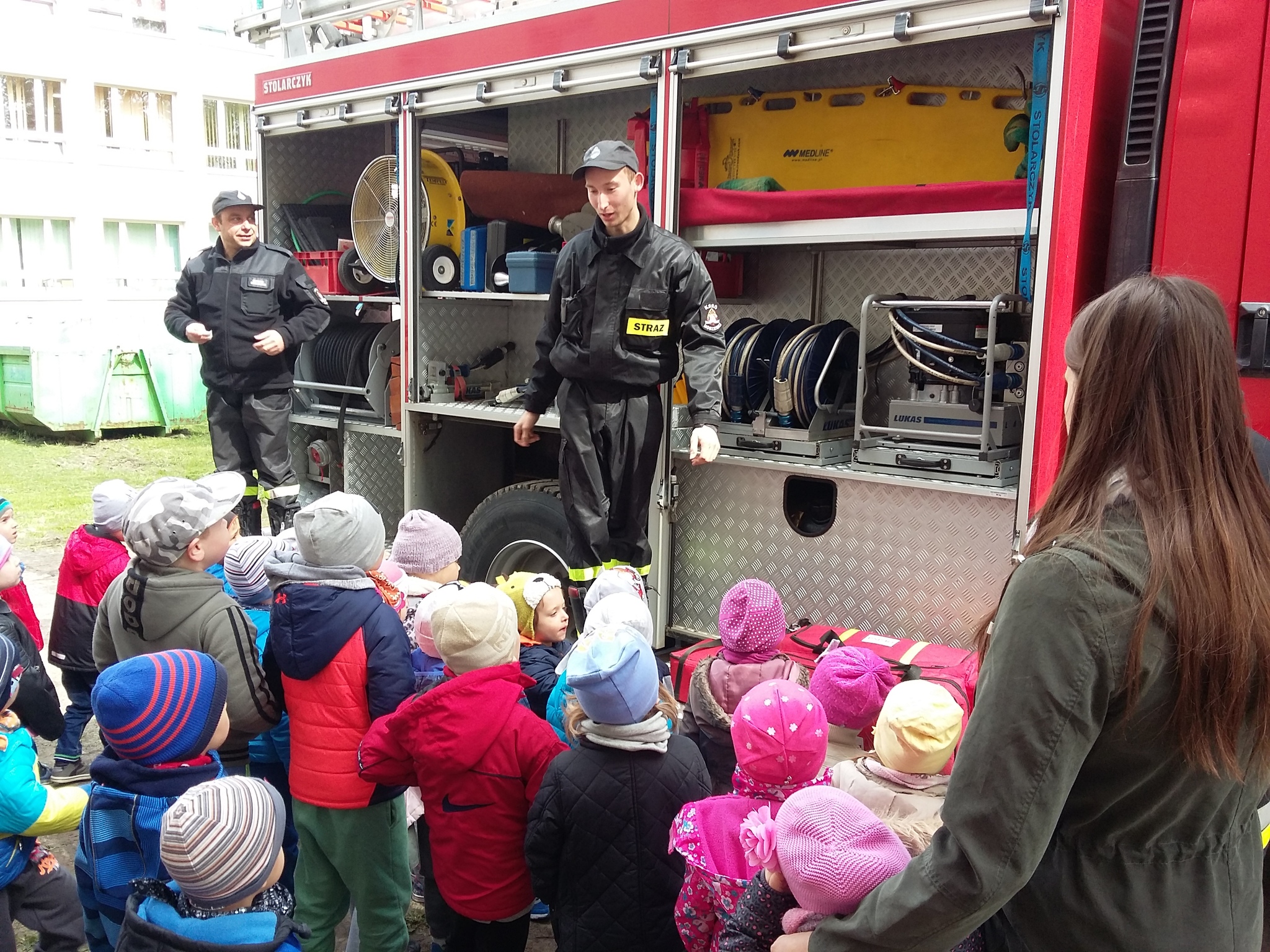 Kolejny dzień był również pełen wrażeń. Pod przedszkole podjechał prawdziwy wóz strażacki! Odwiedzili nas strażacy z Ochotniczej Straży Pożarnej w Moszenkach. Panowie najpierw opowiedzieli dzieciom o zawodzie strażaka, jego stroju i zagrożeniach jakie mogą czyhać gdy w pobliży pojawi się ogień. Przypomnieli również jak należy się wtedy zachować oraz pod jaki numer alarmowy zadzwonić. Największą atrakcją było oglądanie wozu strażackiego. Przedszkolaki dowiedziały się, co potrzebne jest strażakom w ich codziennej pracy oraz miały okazję siedzieć w kabinie wozu i poczuć się jak prawdziwi strażacy. Na zakończenie panowie włączyli sygnały świetlne i dźwiękowe oraz uruchomili prądownice, z której popłyną wielki strumień wody! Dzieci były zachwycone!