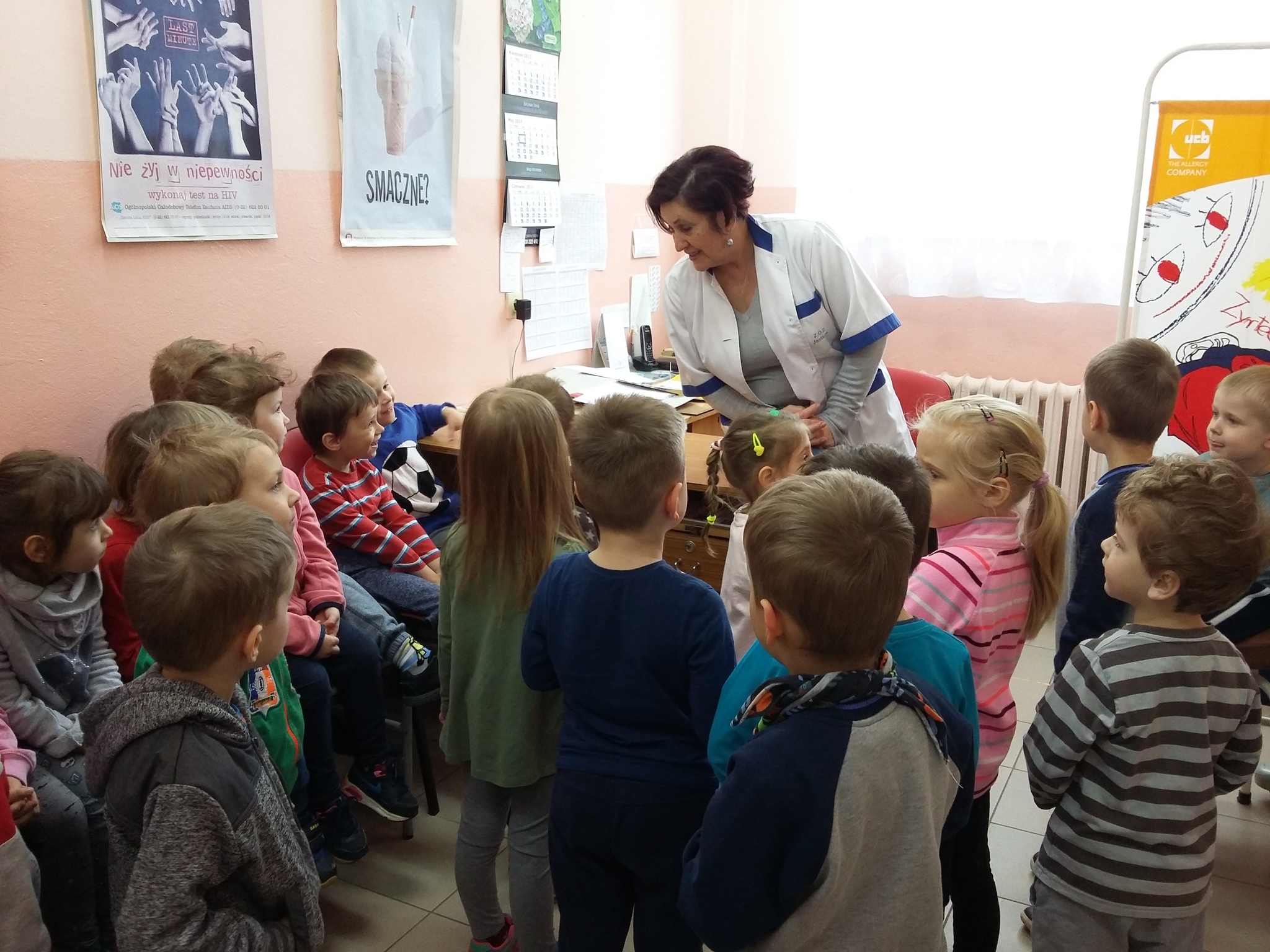 Aby bliżej poznać zawód pielęgniarki, udaliśmy się na krótką wycieczkę do pobliskiej szkoły. Pani Maria Bicka, przyjęła nas w swoim gabinecie, miejscu do którego przychodzą uczniowie, gdy źle się poczują. Przedszkolaki dowiedziały się na czym polega praca pielęgniarki oraz jakich przyrządów używa podczas wstępnego badania. Pani Maria zmierzyła wszystkie dzieci oraz przypomniała im jak należy się odżywiać by być silnym i zdrowym. Na zakończenie wizyty wszyscy mali pacjenci dostali kolorowe naklejki „Dzielnego Pacjenta”.