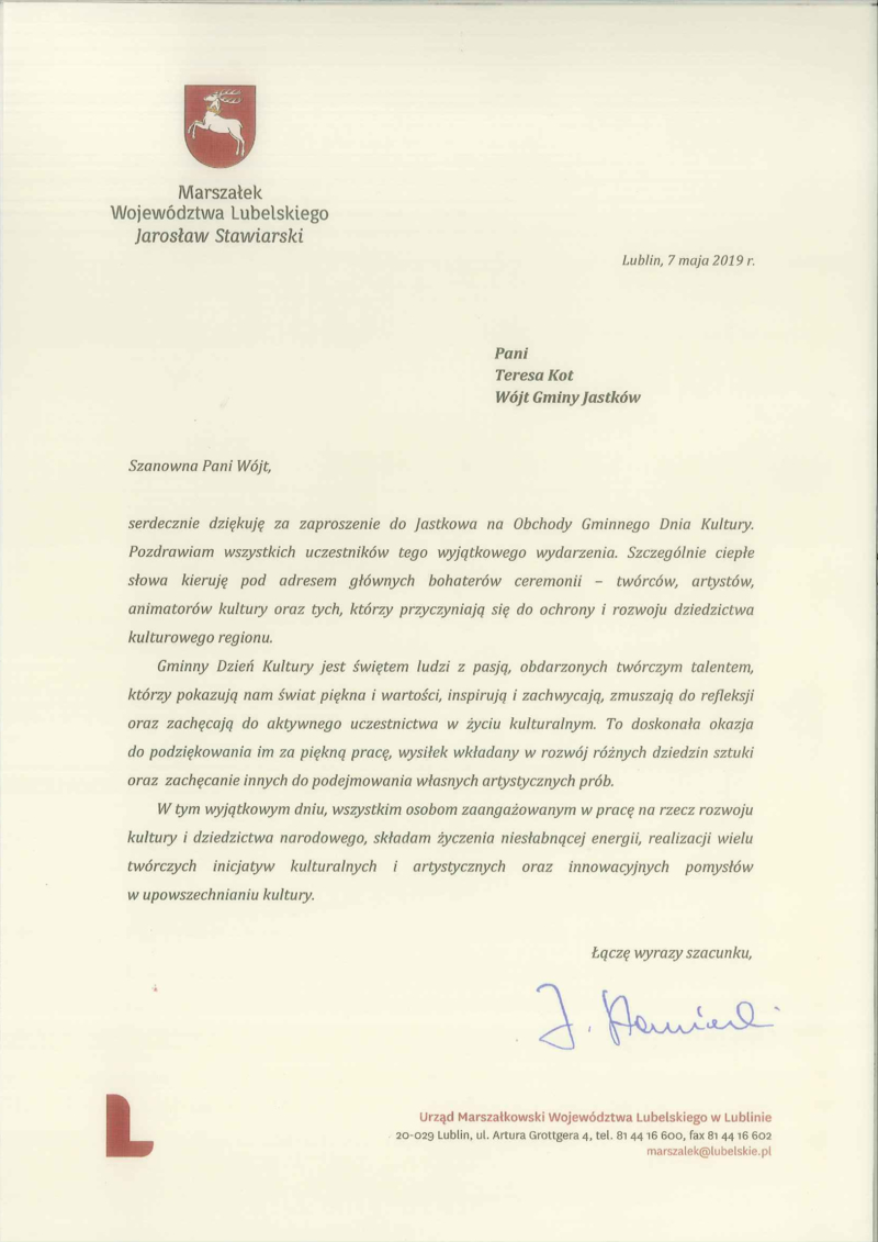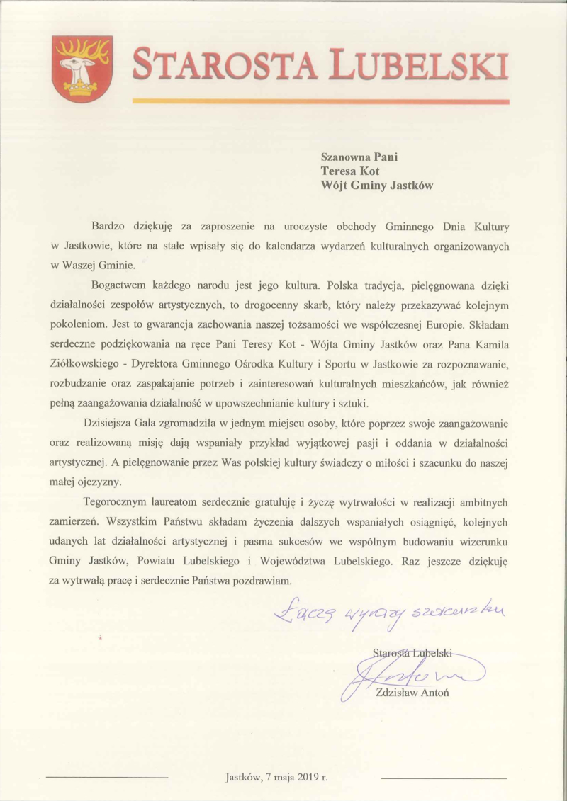 Po wystąpieniu młodego artysty głos zabrali pani Teresa Kot Wójt Gminy Jastków oraz pan Marek Wieczerzak Przewodniczący Rady Gminy, którzy na ręce dyrektorów Instytucji Kultury Gminy Jastków - Magdaleny Zarzeki – Dyrektora Gminnej Biblioteki Publicznej oraz Kamila Ziółkowskiego – Dyrektora Gminnego Ośrodka Kultury i Sportu, złożyli podziękowania dla wszystkich pracowników za twórczy wkład w kształtowanie i rozwój kultury w gminie Jastków.